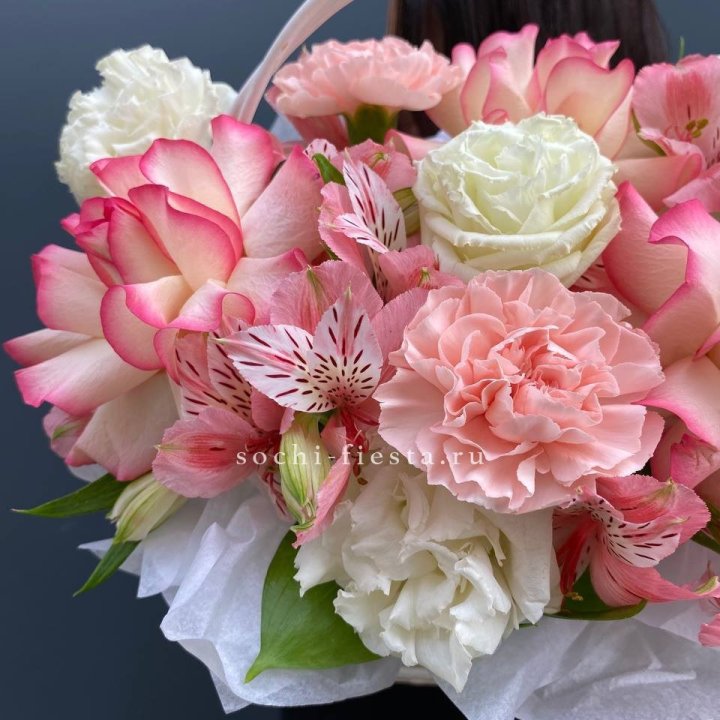 В сезон (весна и лето) ассортимент шире: пионы, ранункулюсы, тюльпаны местные и голландские, ромашки, гортензия. Круглый год — розы от 50 см стебель, кустовые хризантемы, альстромерия, гипсофила, эустома, гвоздики, эвкалипт для миксов.