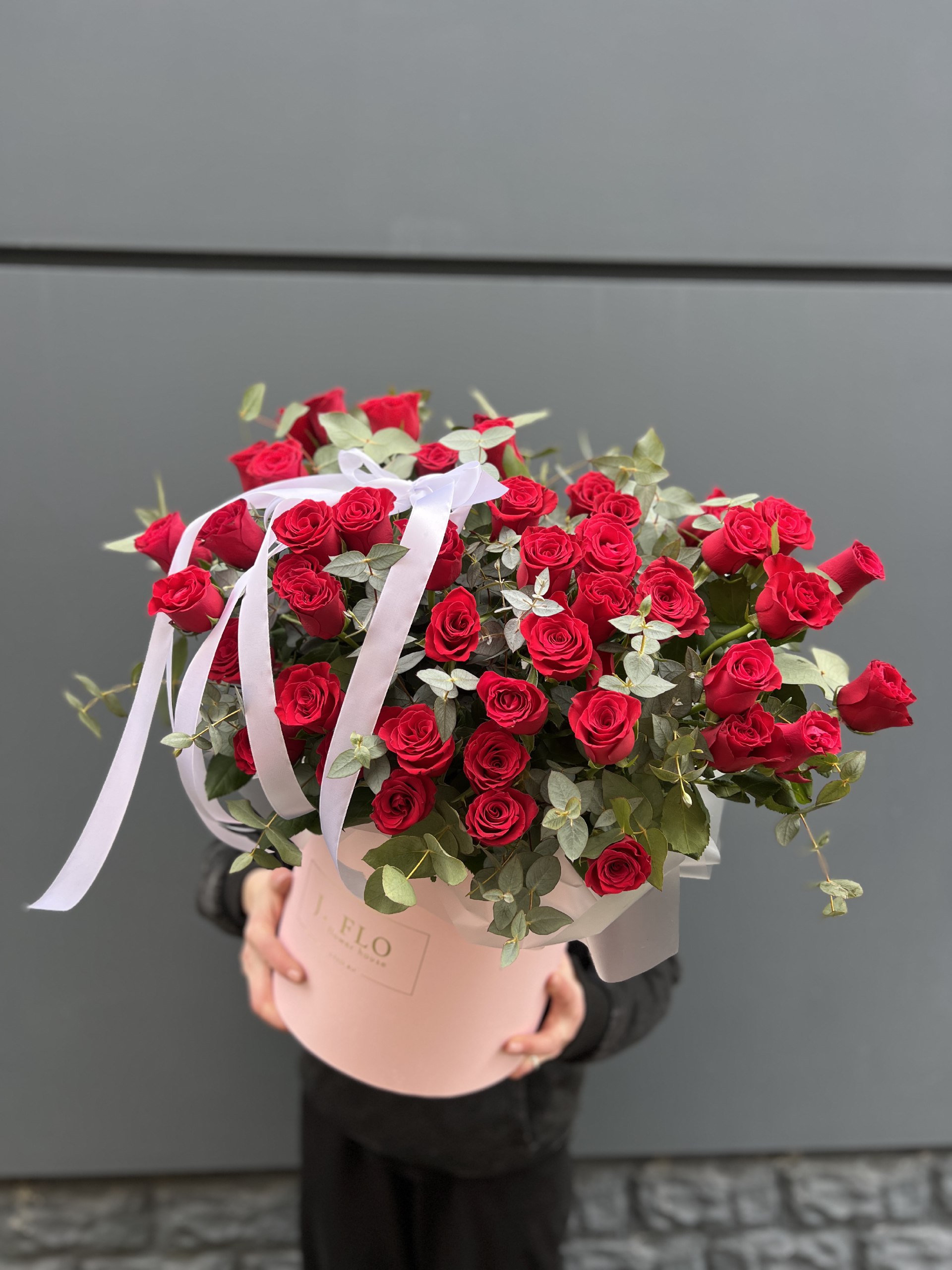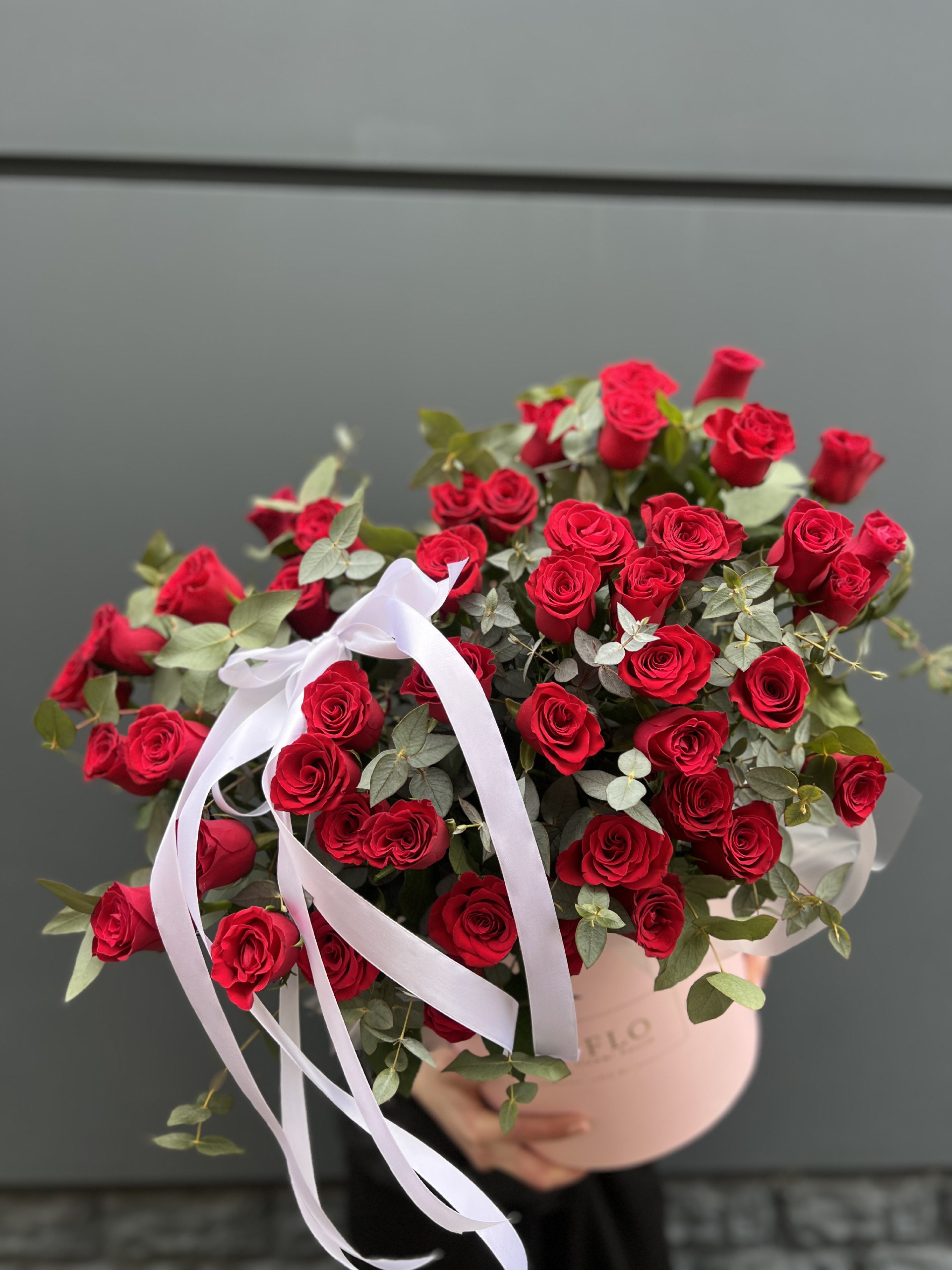Двадцать одна роза глубокого красного оттенка собрана в плотную композицию с бордовым амарантом и натуральными сухоцветами. Насыщенность цвета создает выразительный образ, а округлая коробка сохраняет форму и свежесть бутонов надолго.