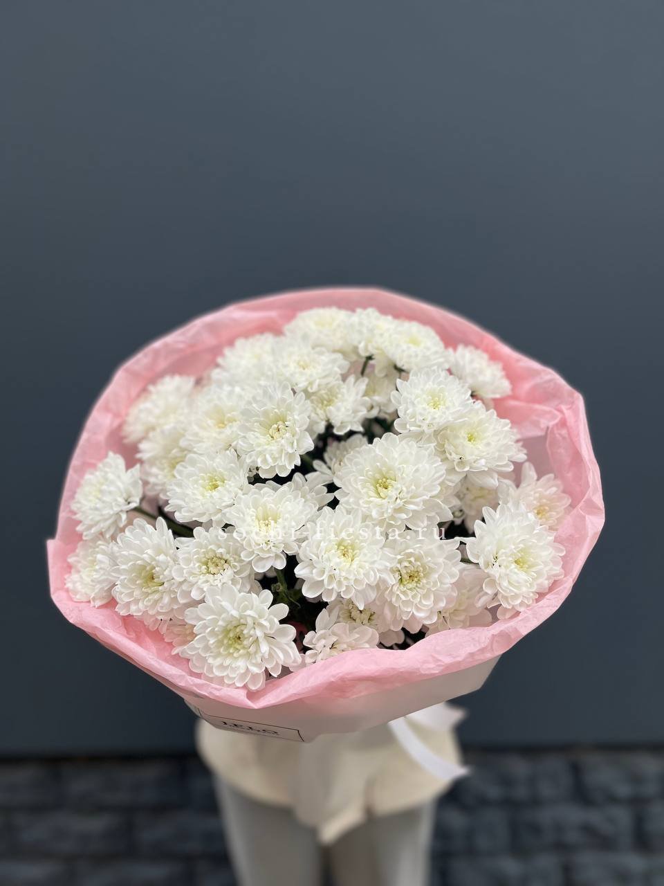 Пять кустовых хризантем собраны в лаконичный букет с мягким обрамлением. Пышные соцветия создают воздушный объем и заполняют пространство легкостью.