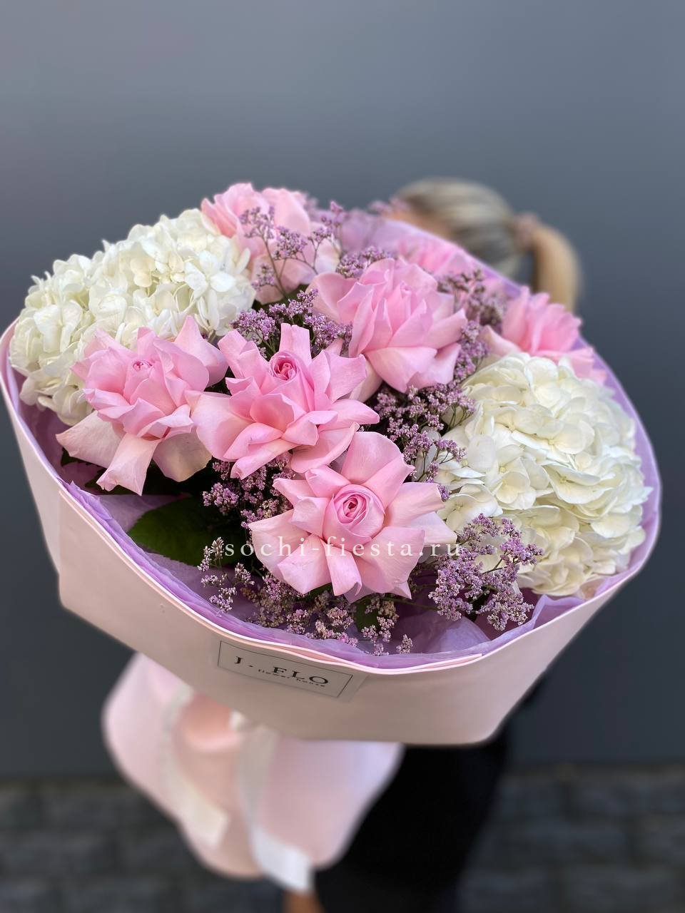 Букет с вывернутыми розами и пушистыми шапками гортензии создает легкое французское настроение. Лимониум вплетается тонкими ветвями, добавляя воздуха между бутонами.