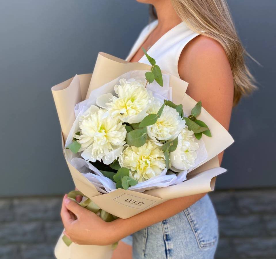 Белые пионы с серебристым эвкалиптом собраны в лаконичный букет. Прозрачная упаковка сохраняет свежесть и подчёркивает естественную красоту бутонов.