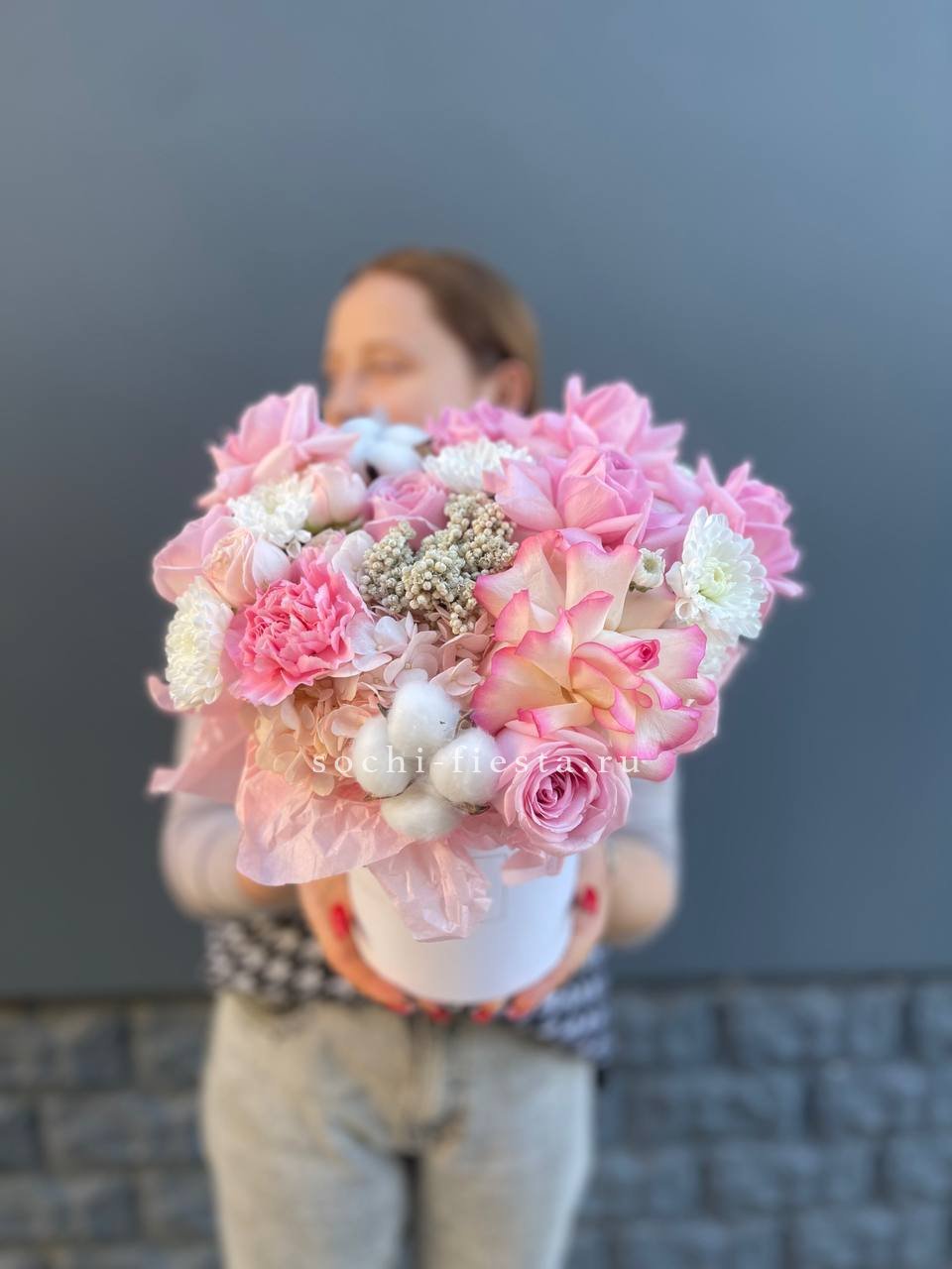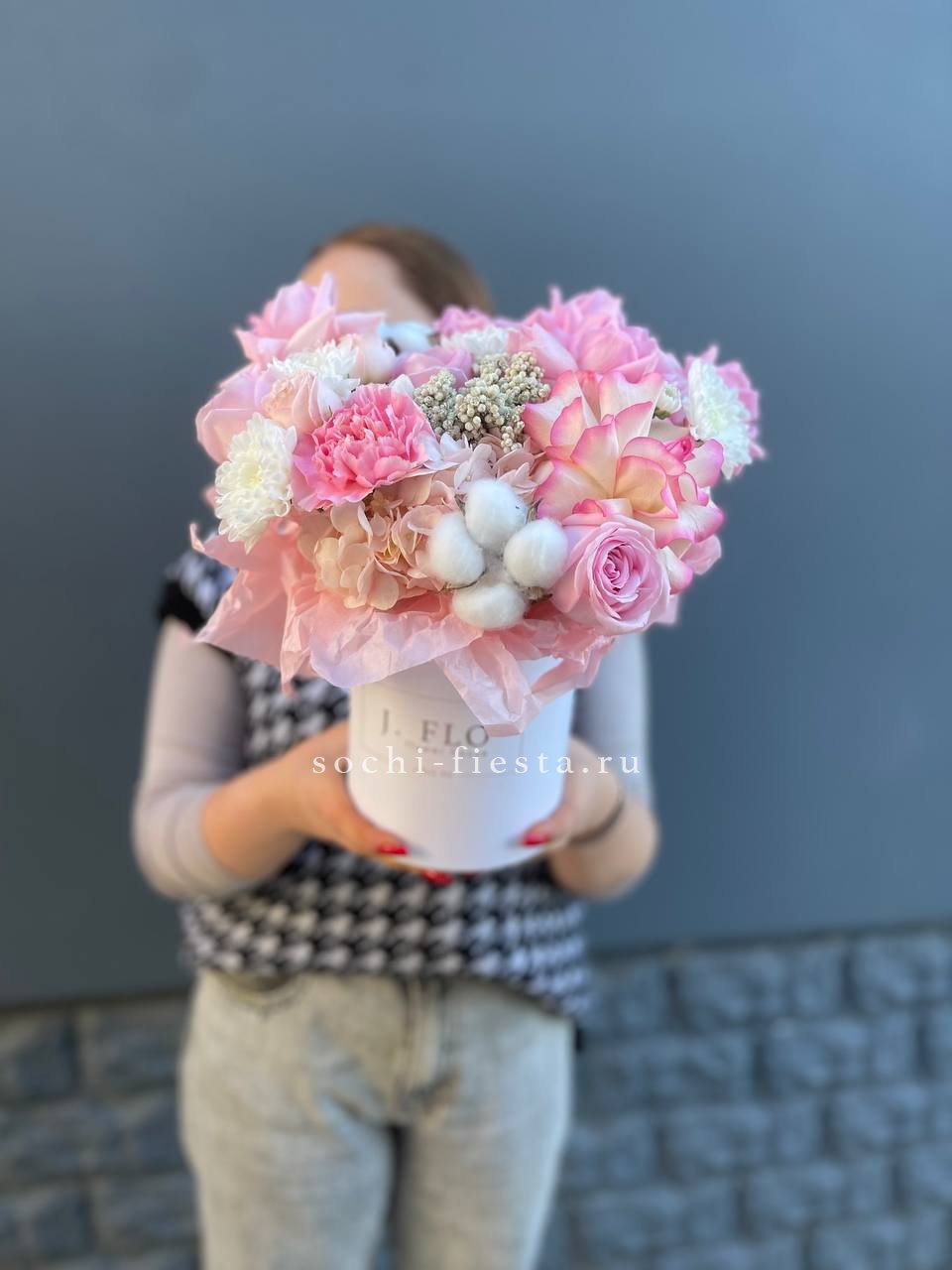 Сочетание пышной голубой гортензии и классических белых роз — это гимн нежности и чистоты. Букет, который не просто удивляет своим масштабом, но и дарит ощущение безмятежности. Идеальный выбор для самого искреннего признания.