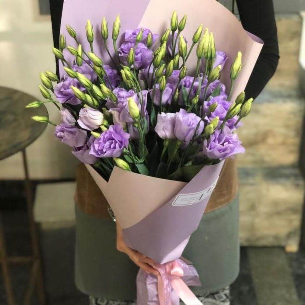 Пять веточек эустомы дополнены эвкалиптом и собраны в компактную композицию. Серебристая зелень добавляет глубину и свежесть между пышными бутонами. Лаконичный букет с продуманной структурой.