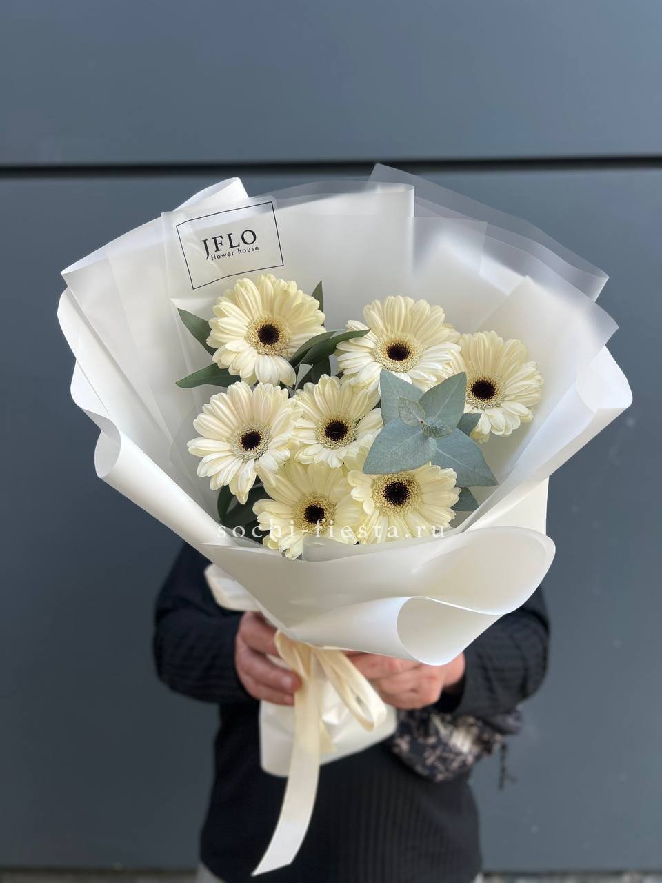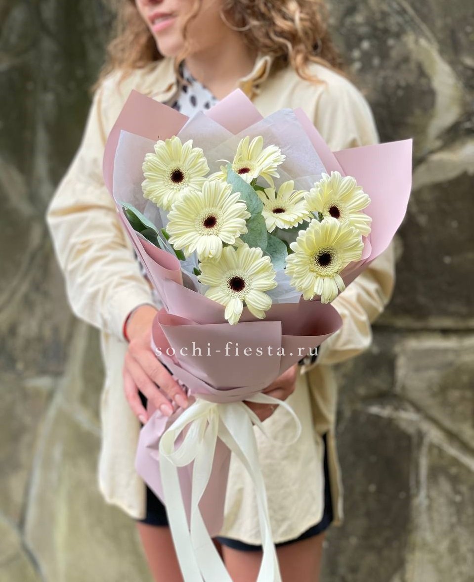 голландская гербера 7 шт., лента, дизайнерская упаковка Оттенок гербер может быть согласован с заказчиком.