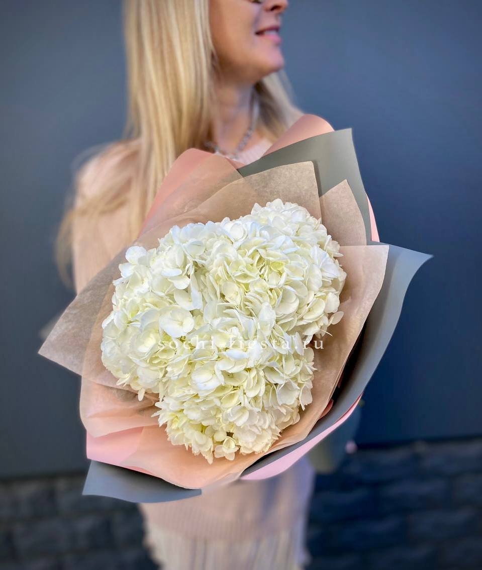 Воздушные шапки соцветий собраны в пышную охапку белоснежного цвета. Гортензия создаёт объёмную текстуру и заполняет пространство мягким природным светом. Букет для тех, кто ценит чистоту линий и естественную красоту.