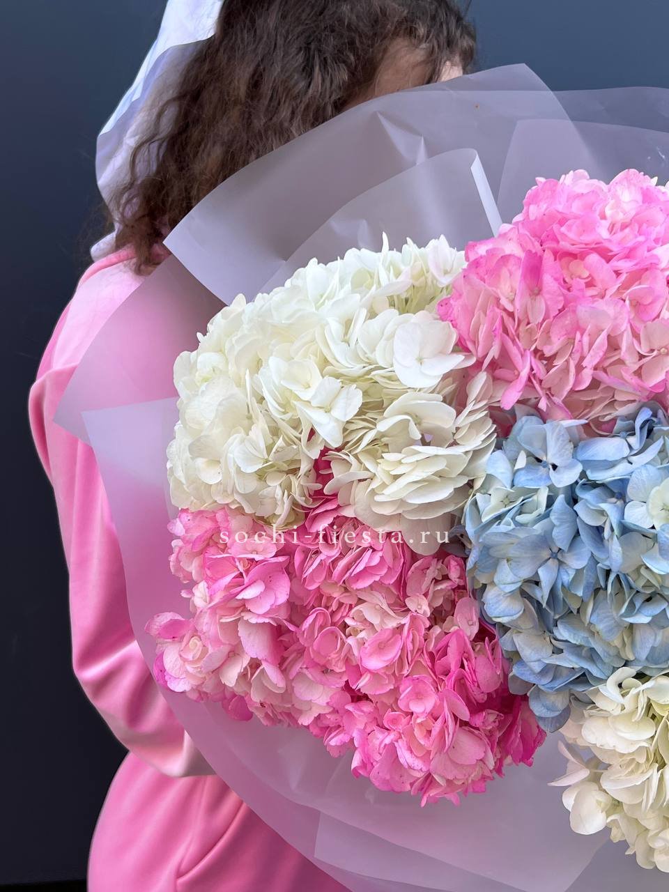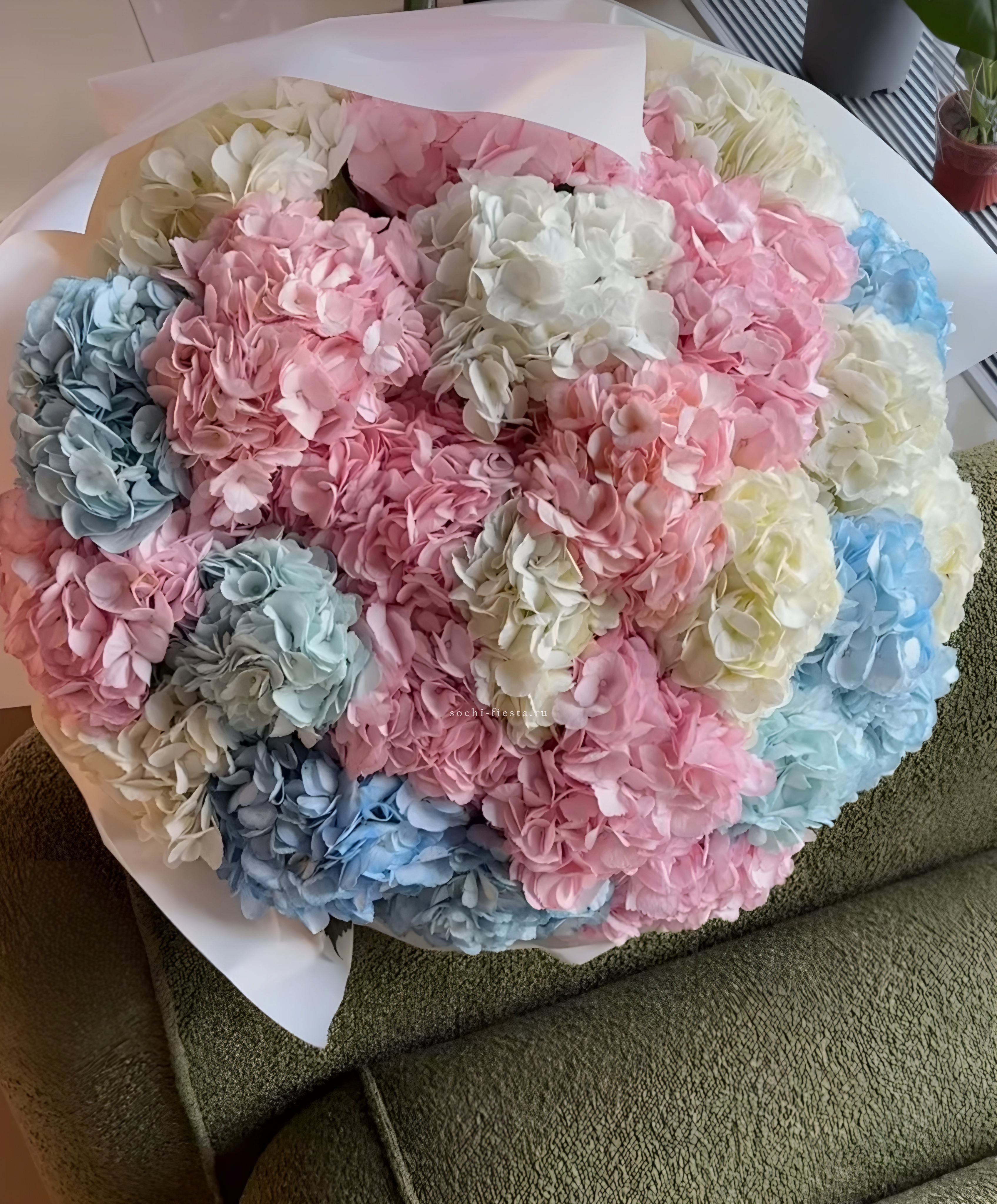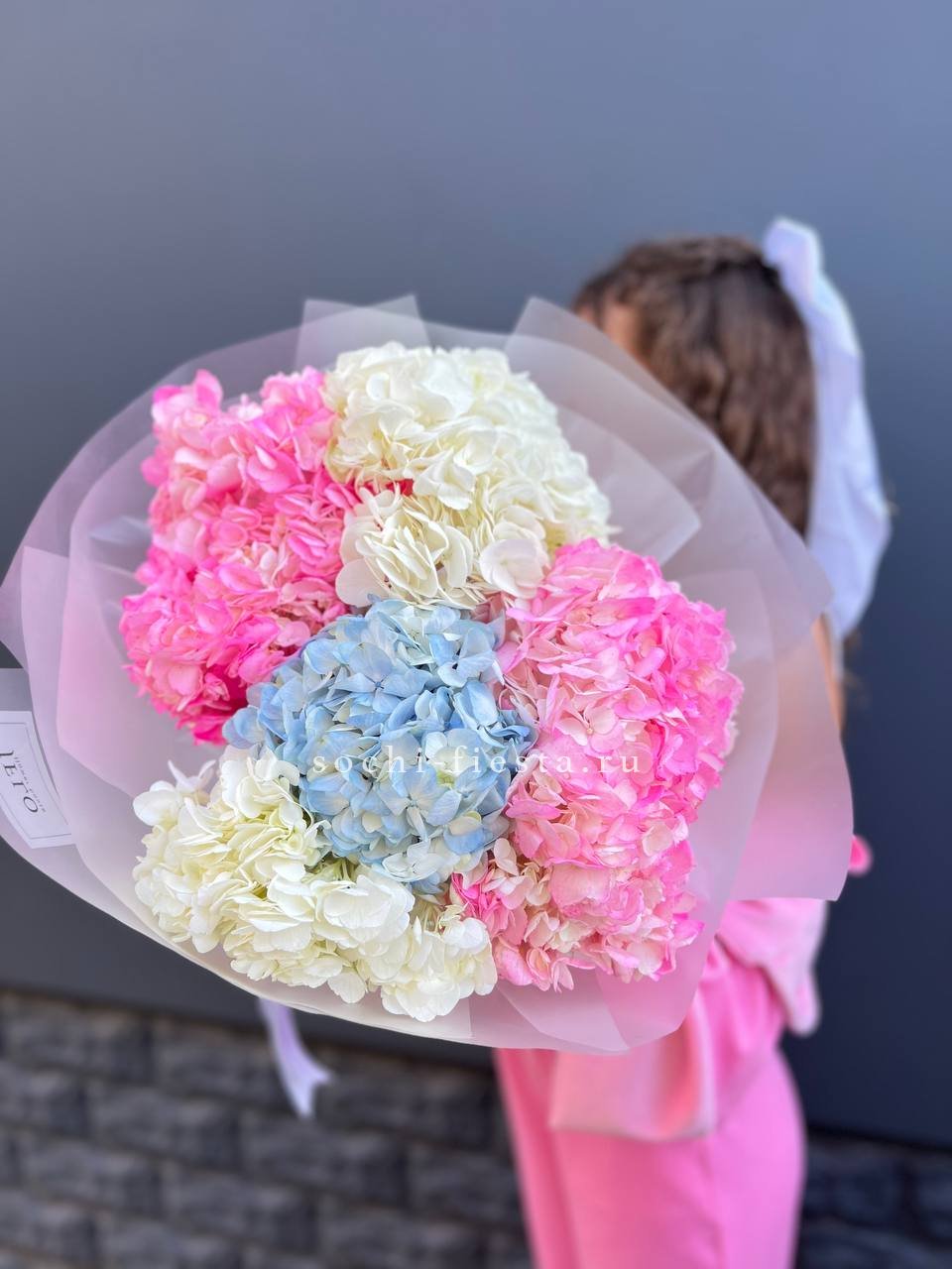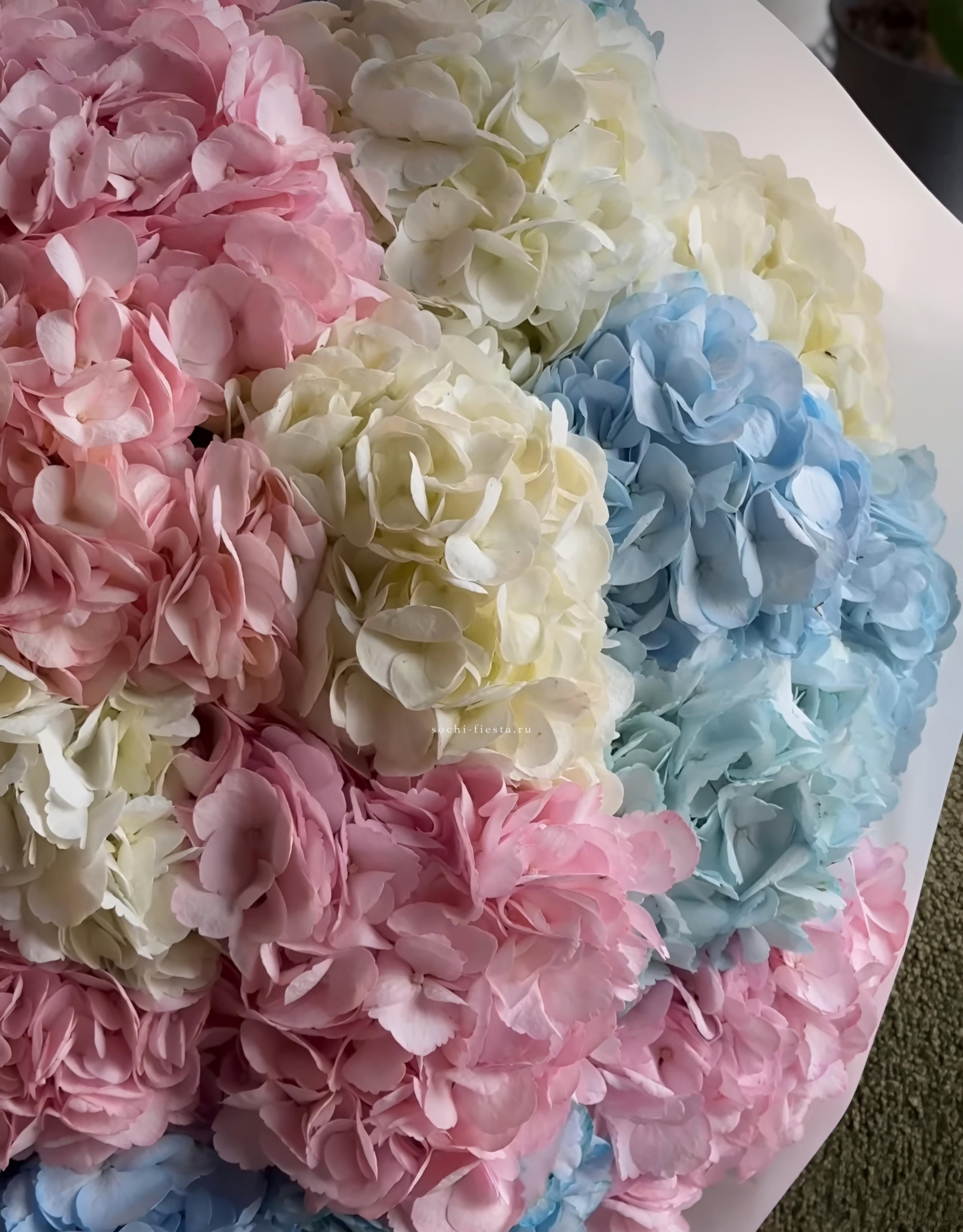 Пышные шапки розовой гортензии собраны в объёмную охапку, где каждое соцветие создаёт мягкую фактурную волну. Оттенок варьируется от пудрового до насыщенного ягодного, формируя живописную глубину.