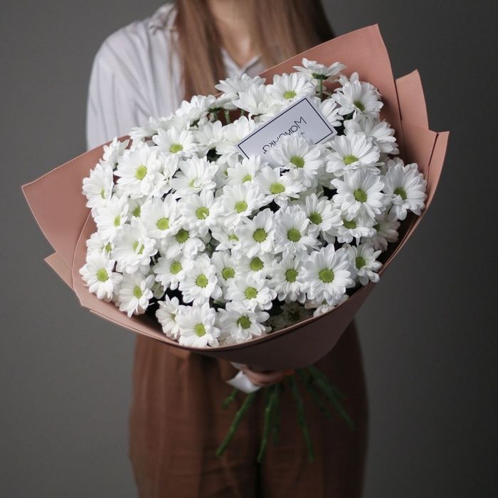 Семь хризантем собраны в плотную округлую форму и украшены бежевой упаковкой с тремя тонкими бантами. Сердечки на лентах добавляют композиции трогательности. Букет держит форму и выглядит аккуратно в руках или в вазе.