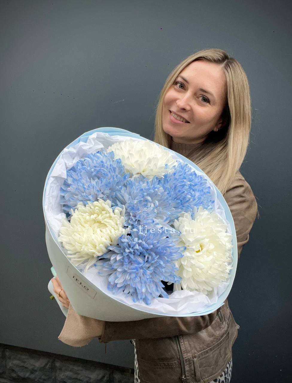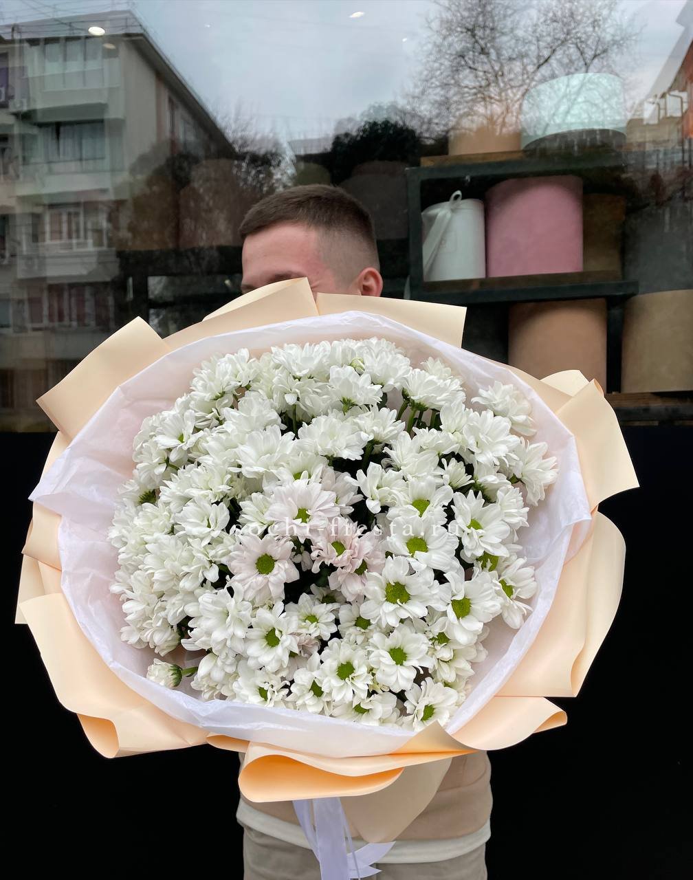 Семь крупных хризантем с открытыми бутонами в дизайнерской упаковке. Букет выглядит свежо и современно, легко вписывается в любое пространство.