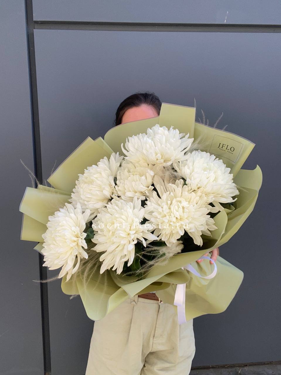 Крупные головки хризантем дополнены воздушными метёлками ковыля. Лаконичная упаковка сохраняет естественную красоту цветов и позволяет разместить букет в любом пространстве.