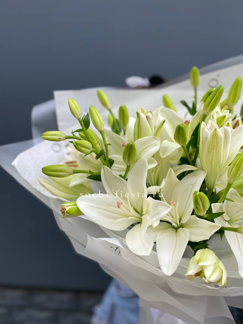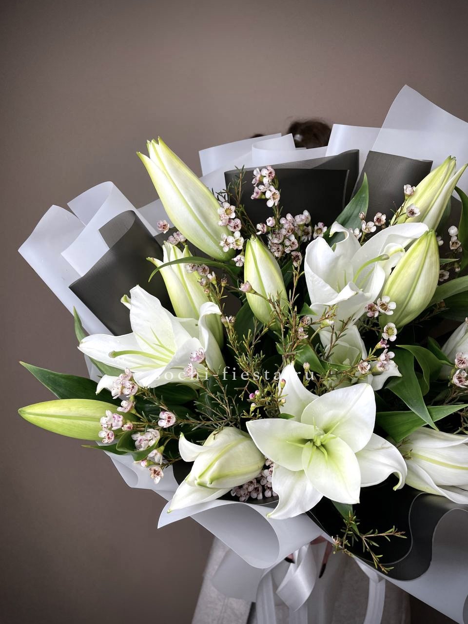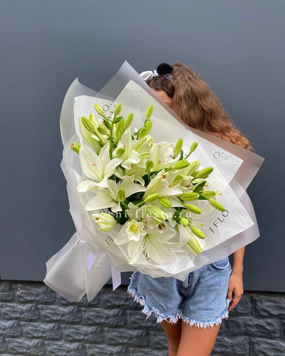 Пять белых лилий в крафтовой обёртке — классика без лишних деталей. Бутоны крупные, с выраженной фактурой лепестков и насыщенным ароматом. Простая форма букета подходит для любого повода и интерьера.