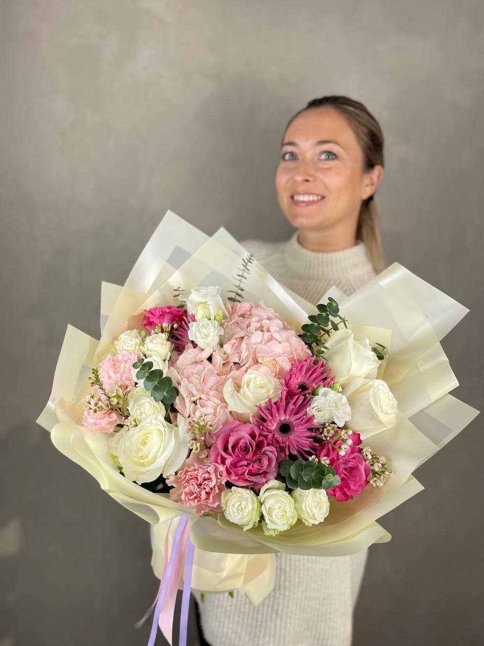 гортензия, роза пионовидная, гербер экзотический, роза одноголовая, пионовидная кустовая роза, хамелациум (или аналог), эвкалипт, дизайнерское оформление.