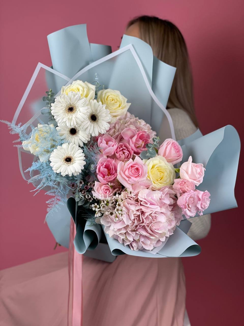 гортензия, роза одноголовая, роза кустовая Мисти Баблс, эустома, диантус, эвкалипт, лента, дизайнерская упаковка.