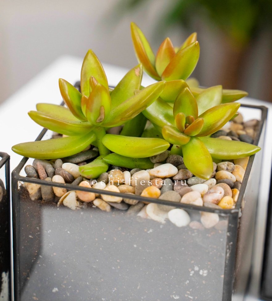 Стеклянный куб с седумом занимает немного места и вписывается в любой интерьер. Суккулент сохраняет свежесть долго и не требует частого полива.