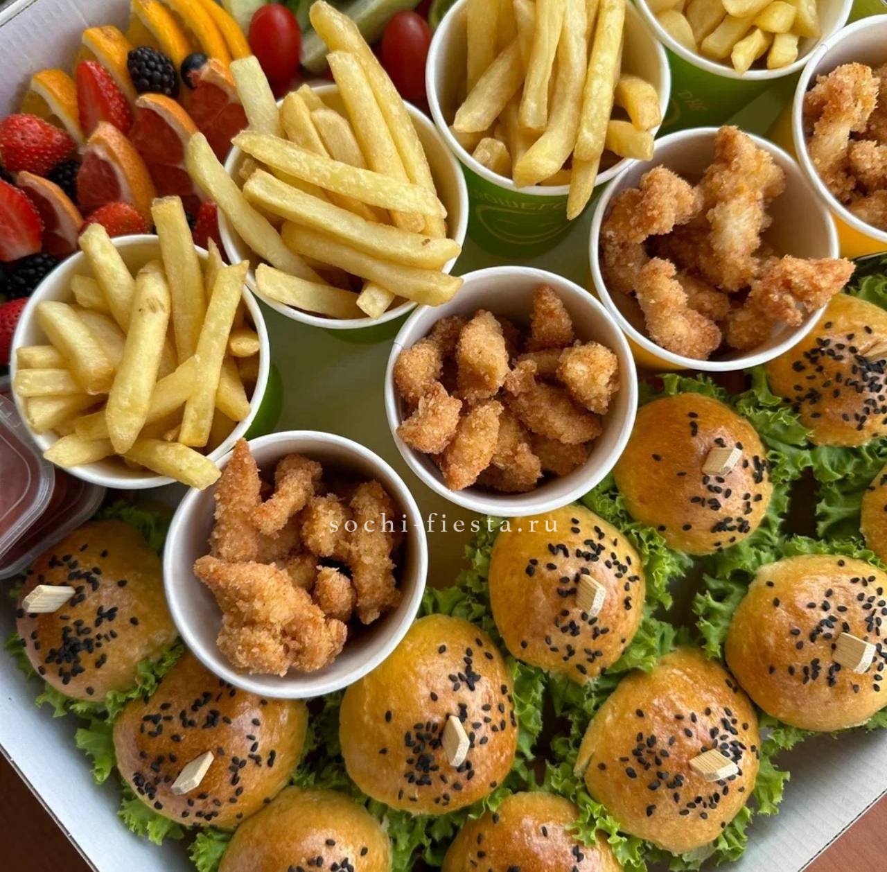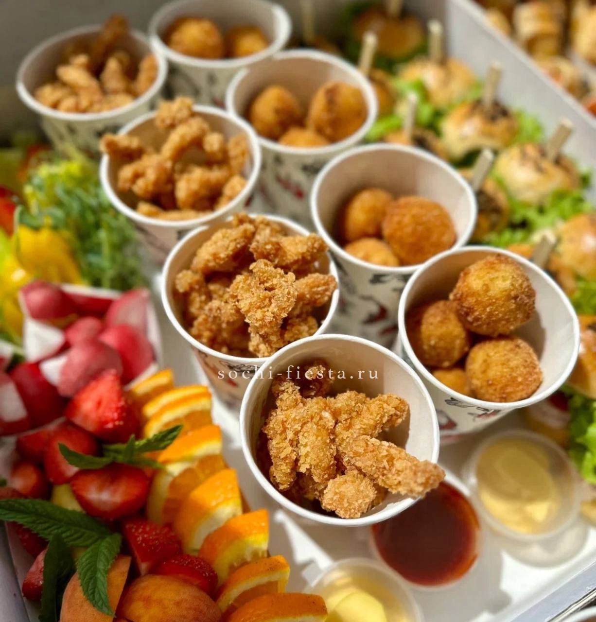 мит боллы- 12 шт. Сырные вафли- 6 шт. Овощная и фруктовая корзинки. Сосиски в тесте- 6 шт. Мини-оладушки- 80 шт. Улитки с ветчиной и сыром- 6 шт.