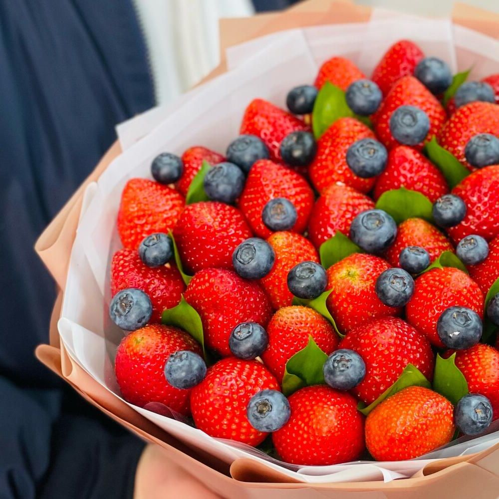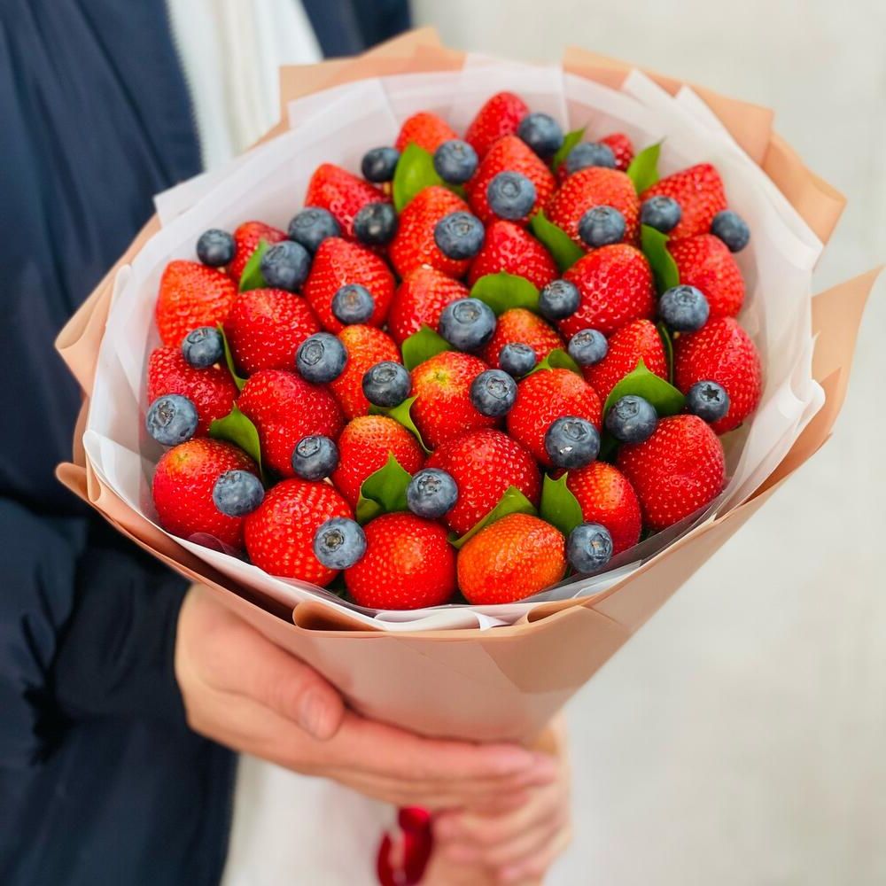 700-800 г. ароматной клубники, голубика, мята или эвкалипт, лента, крафт.