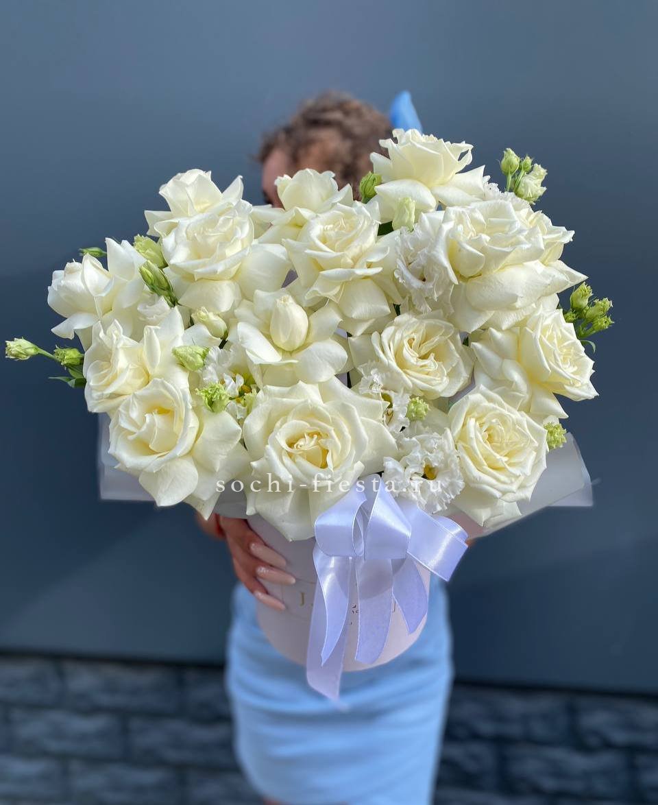 белые розы, эустома, цилиндр D13, эвкалипт, лента, упаковка.
