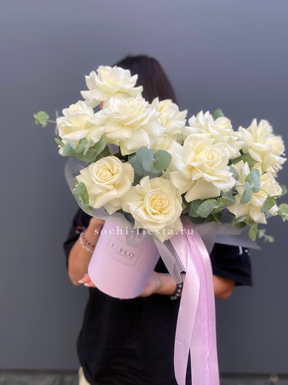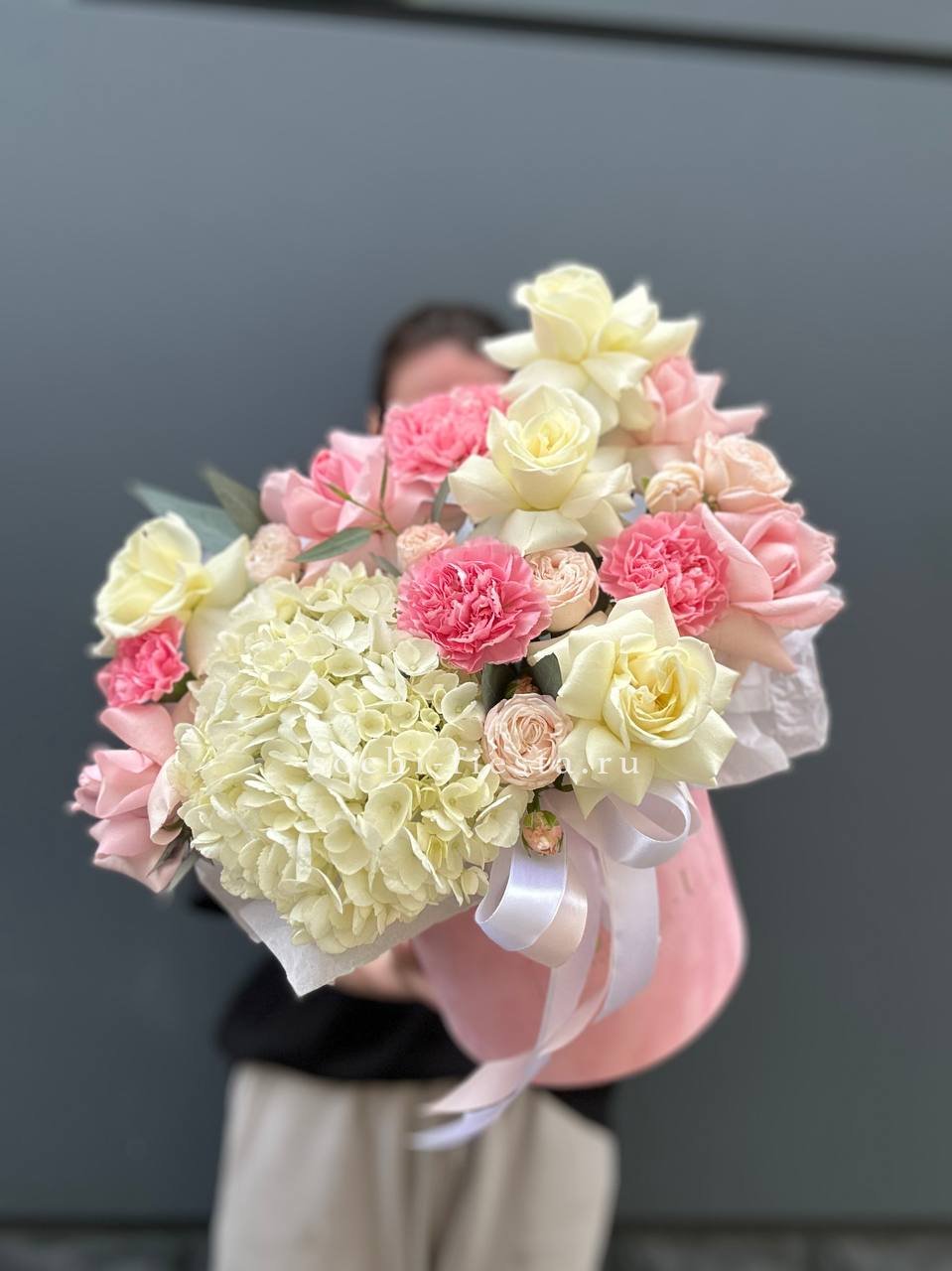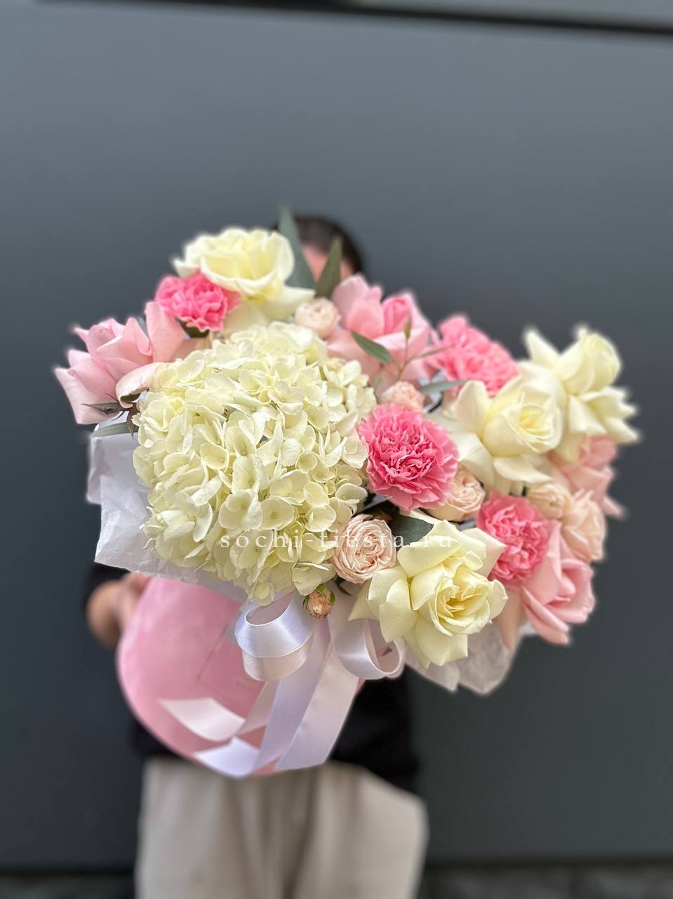 Белоснежные розы и воздушная эустома соседствуют с пышной гортензией и яркими вспышками статицы. Композиция собрана плотно, каждый цветок находит своё место в общем ритме.