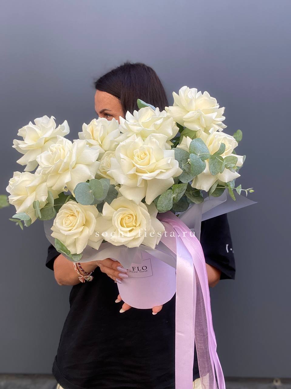 эустома, гортензия, белая роза, диантус, статица, бомбастик, бокс.