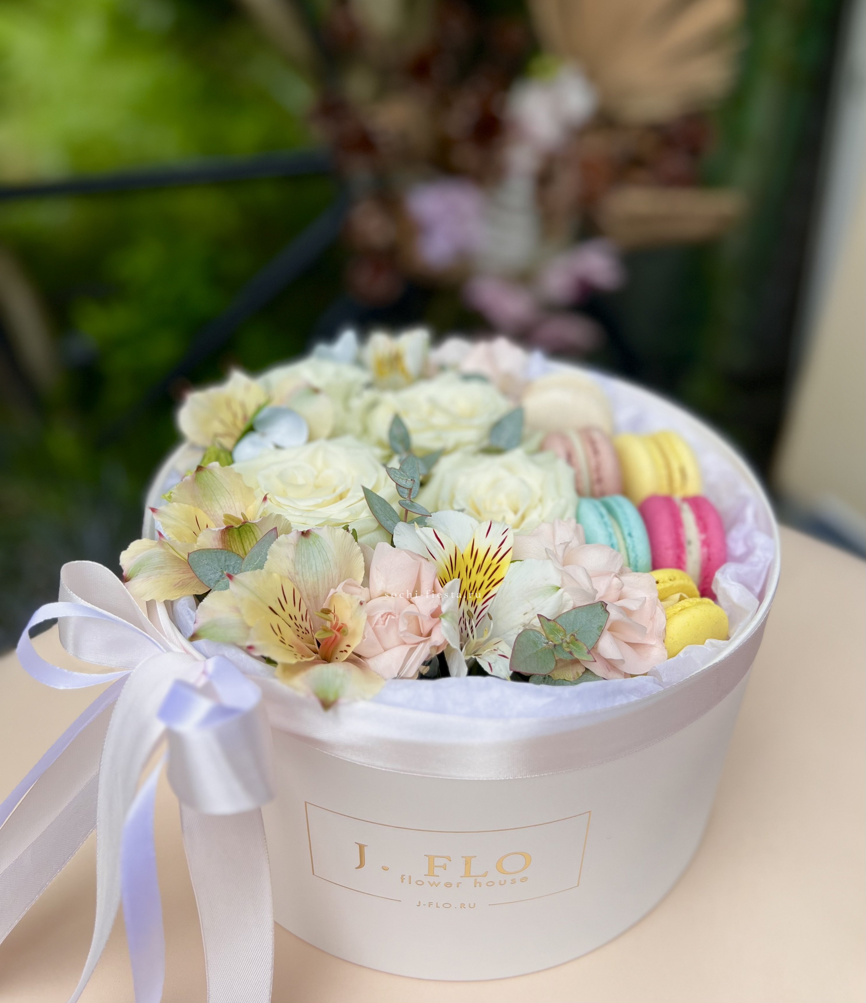 Эустомы и пионовидные розы соседствуют с французскими макарон в коробке в форме сердца. Диантусы и эвкалипт создают объём, а сладкий акцент делает композицию завершённой.
