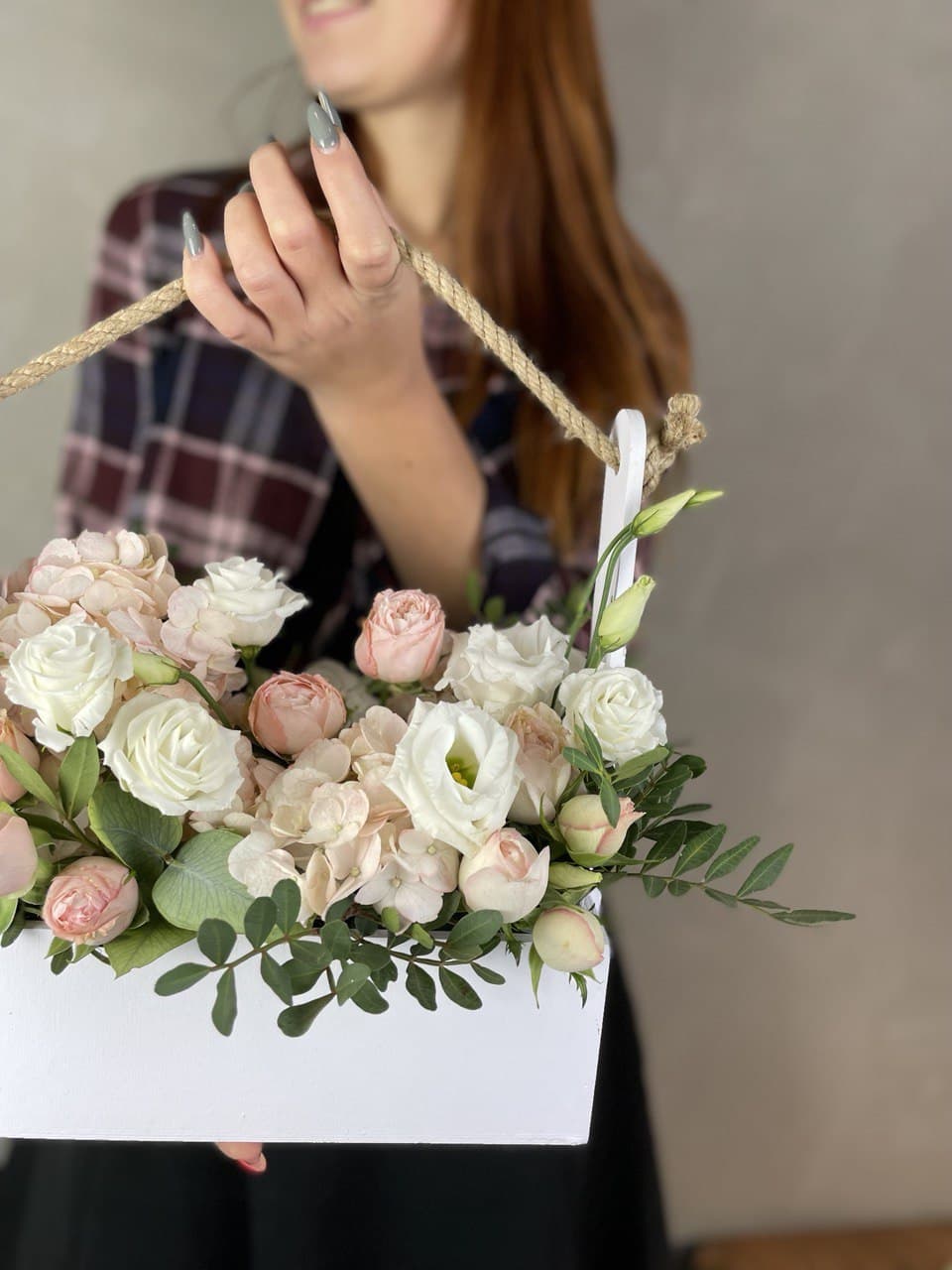 лилии, французские розы, гортензия, альстромерия, статица,деревянный ящик.