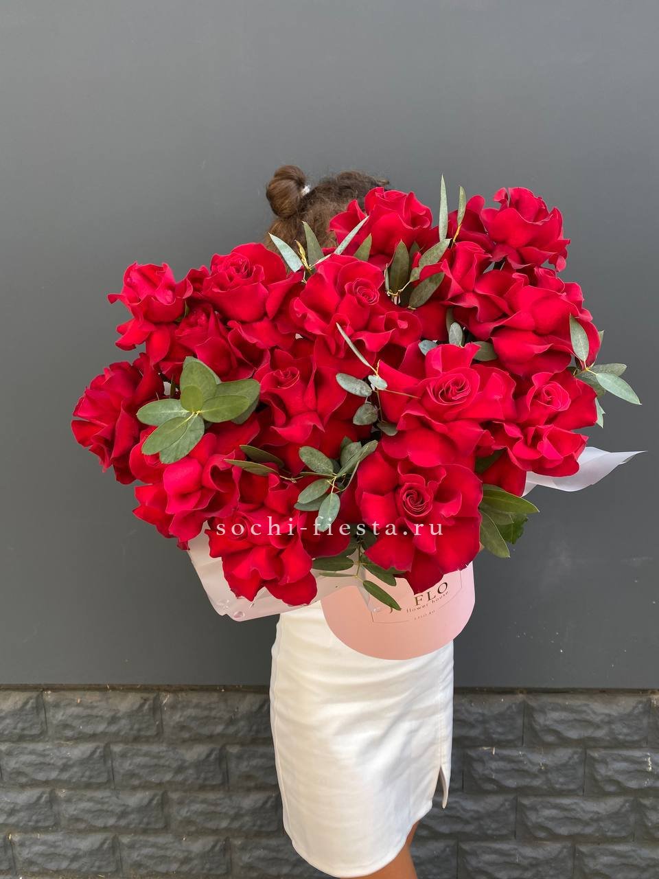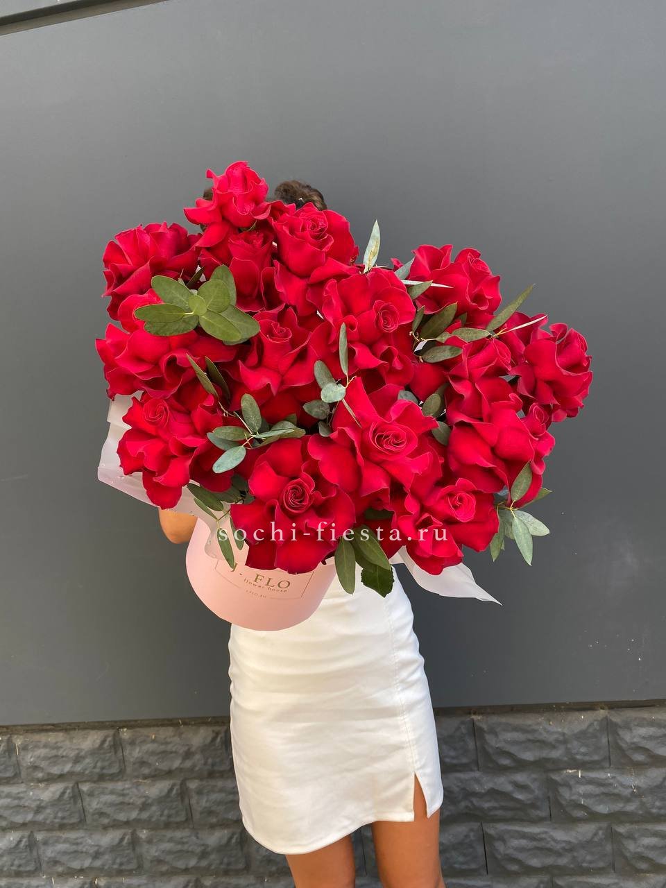 Одиннадцать красных роз выстроены в цилиндре ровным силуэтом. Эвкалипт окружает бутоны по краю и подчеркивает графичность композиции.