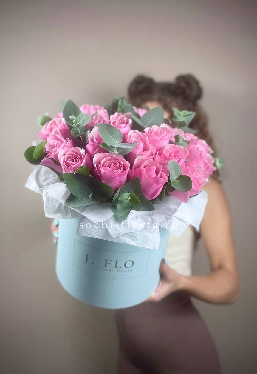 27 розовых роз в шляпной коробке с эвкалиптом.