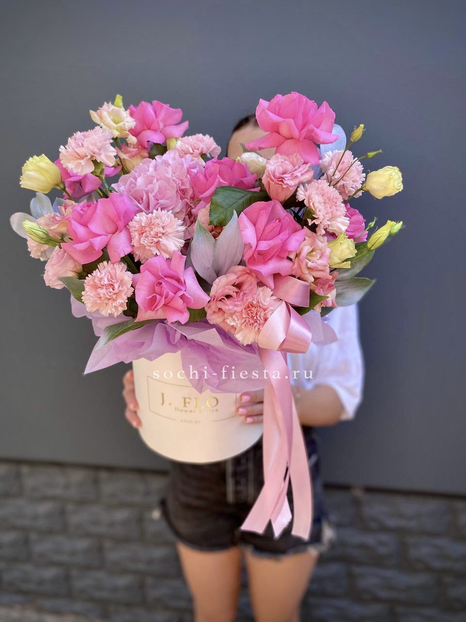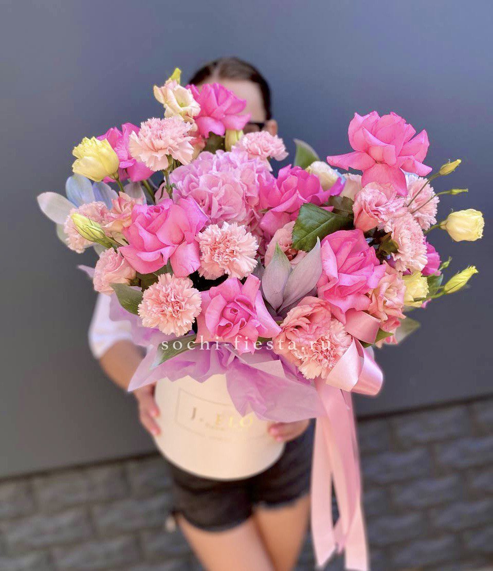 Композиция в коробке объединяет пышную гортензию, воздушную эустому и кустовые розы, Джумилию с яркими гербами и хлопком. Плотное заполнение создает округлую форму, где каждый цветок находит свое место без пустот.