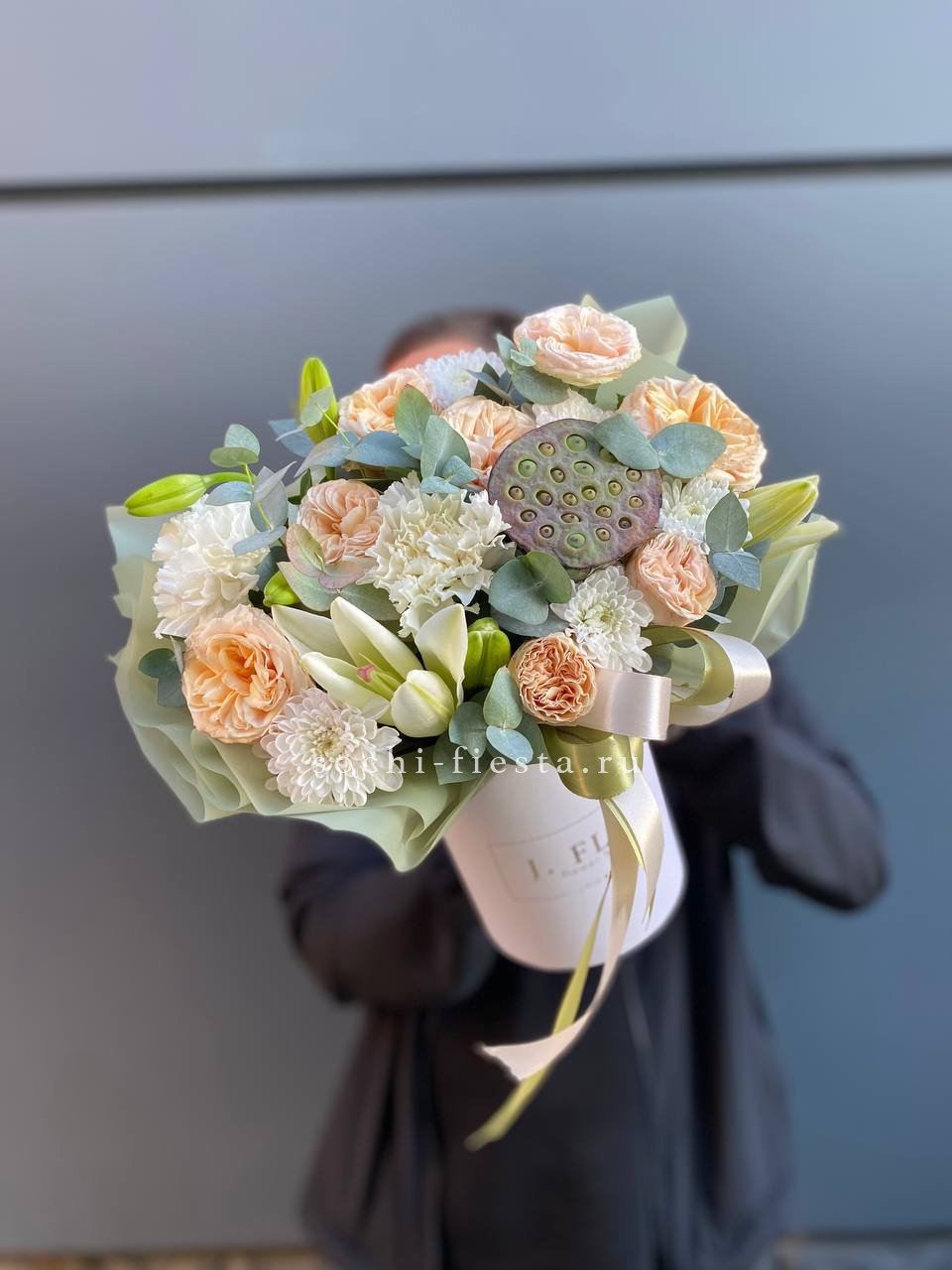 Белые лилии и кустовая роза встречаются с лотосом и диантусом в небольшом боксе. Эвкалипт добавляет свежести легкой водной палитре.