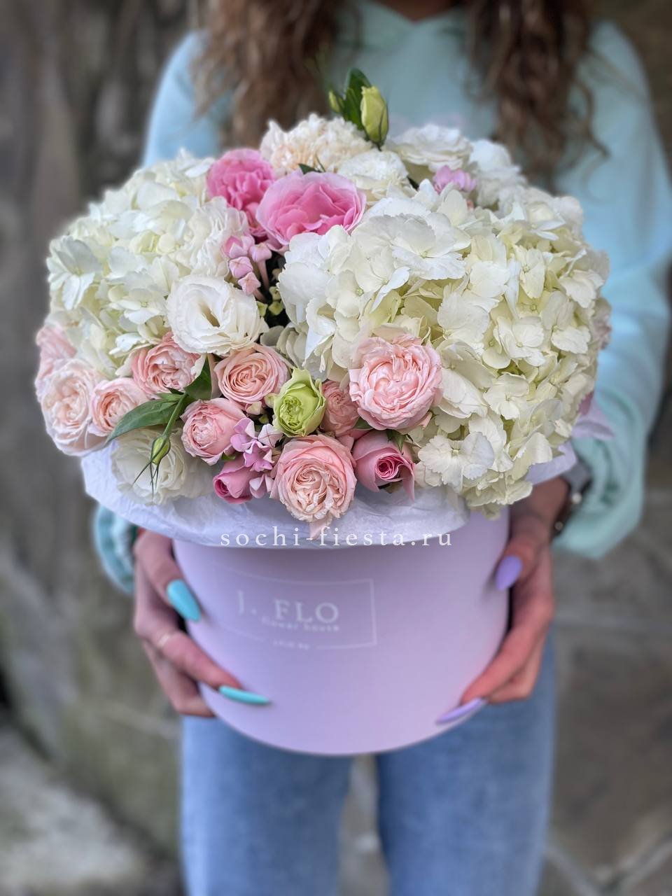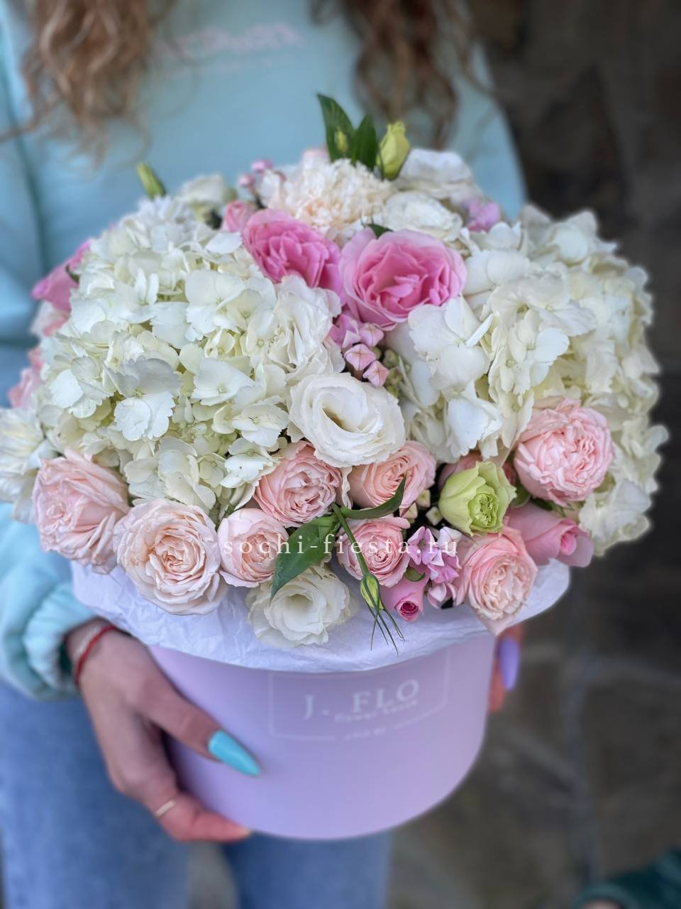 выполнен из гортензии, эустом, диантусов, французских роз, эвкалипт, цилиндр D20.