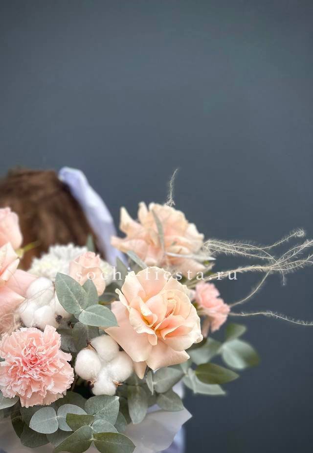 Белоснежные розы и герберы выстраивают чистую цветовую гамму с яркими акцентами диантусов. Эвкалипт вносит графичность и природную фактуру в общую композицию.