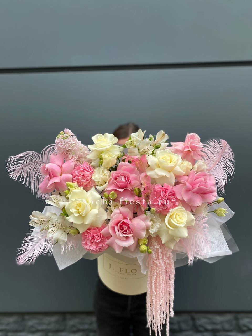 французские розы, альстромерии, маттиола, эустома, амарантус, перья.