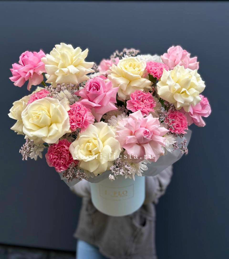 Гортензия обволакивает центр композиции, где розы и диантусы собраны плотной группой. Цилиндр держит форму вертикально, а лента завершает силуэт лаконичной линией.