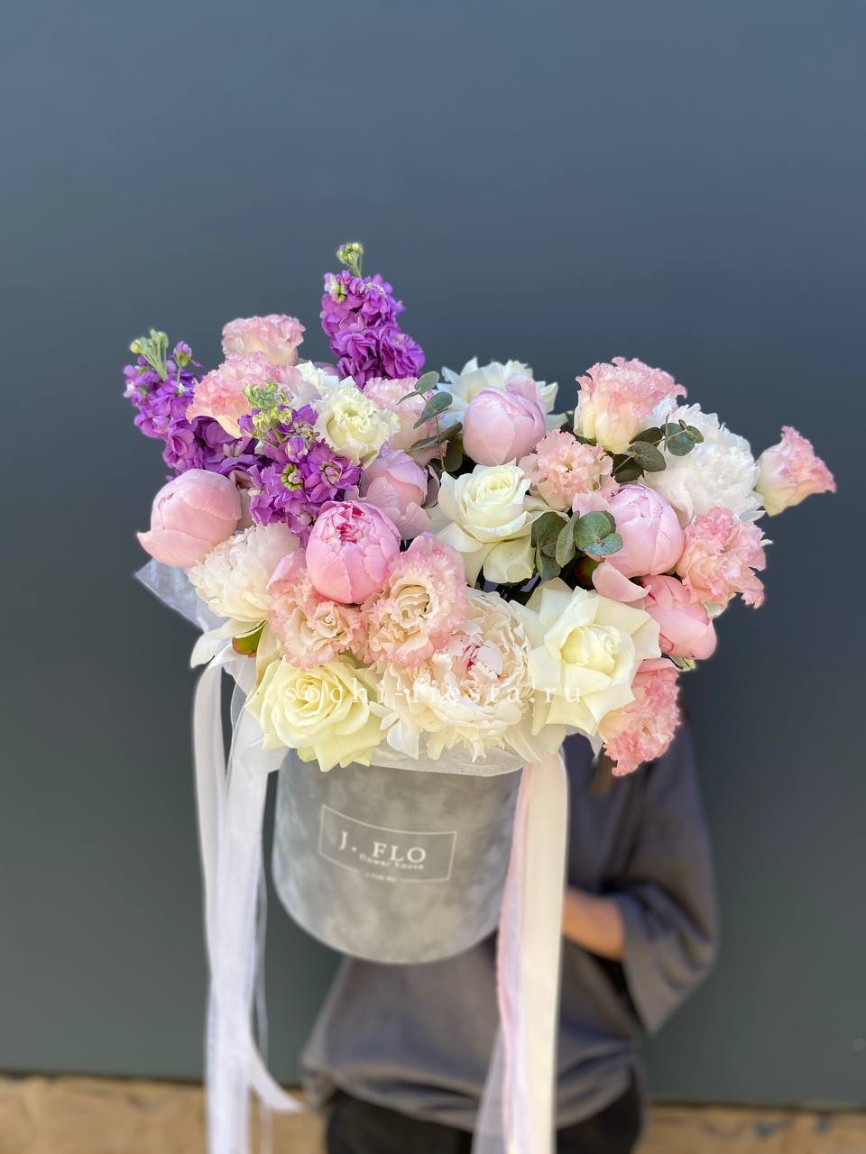 Пионы распускаются крупными шапками, а эустома и маттиола заполняют пространство воздушными соцветиями. Композиция собрана плотно, каждый бутон находит своё место в общем ритме.
