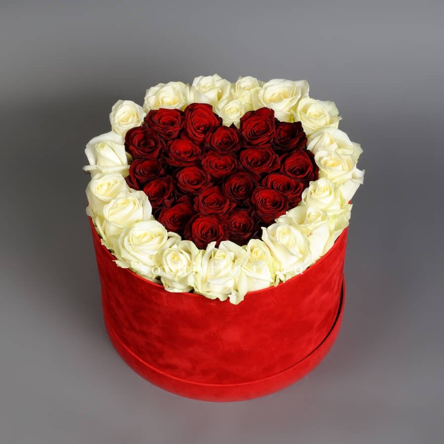 Тринадцать французских роз в двух цветах уложены так, что белый и красный чередуются ровными рядами. Компактный цилиндр фиксирует букет и позволяет разместить его на узкой поверхности.