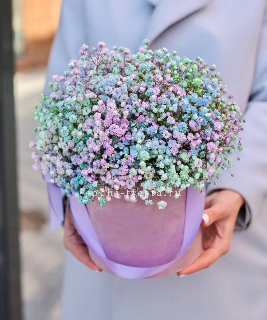 Радужные соцветия гипсофилы заполняют коробку воздушным облаком. Переливы оттенков создают калейдоскопический эффект. Лёгкая структура и яркая палитра освежают пространство.