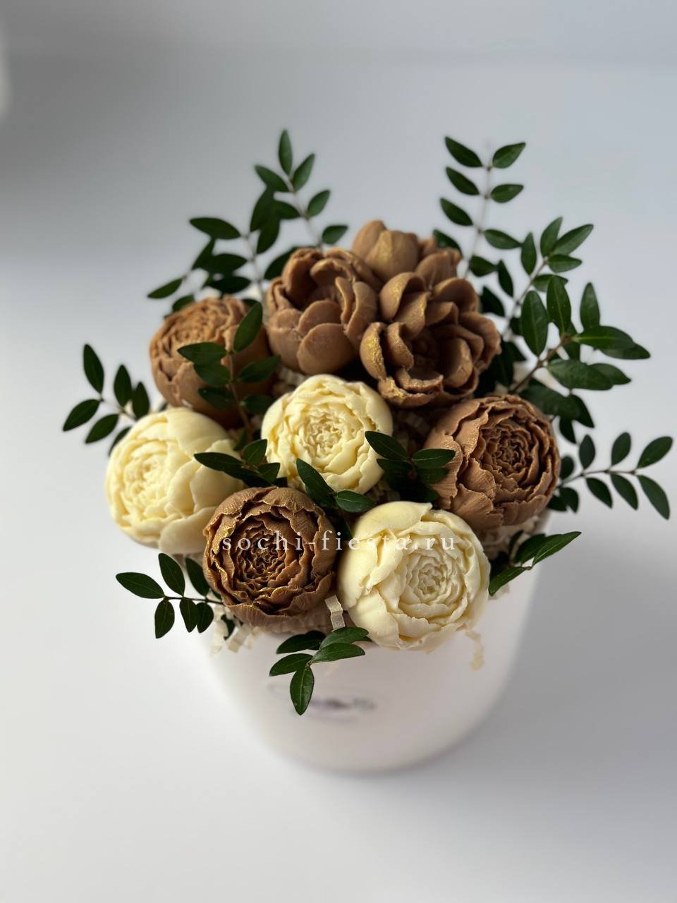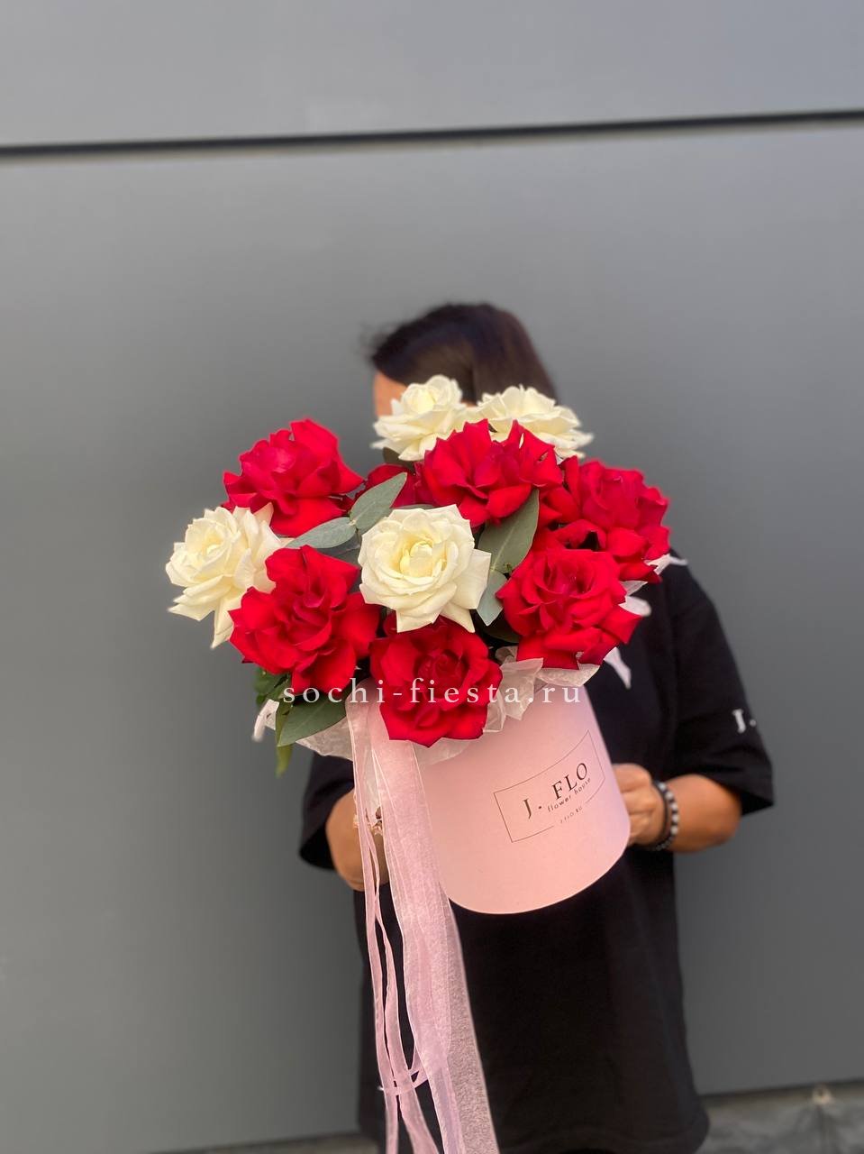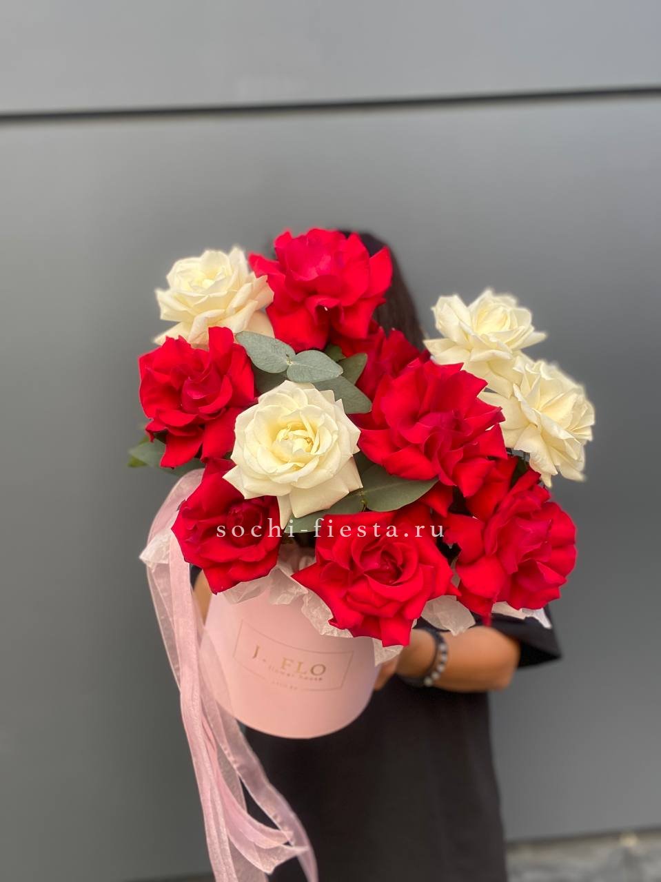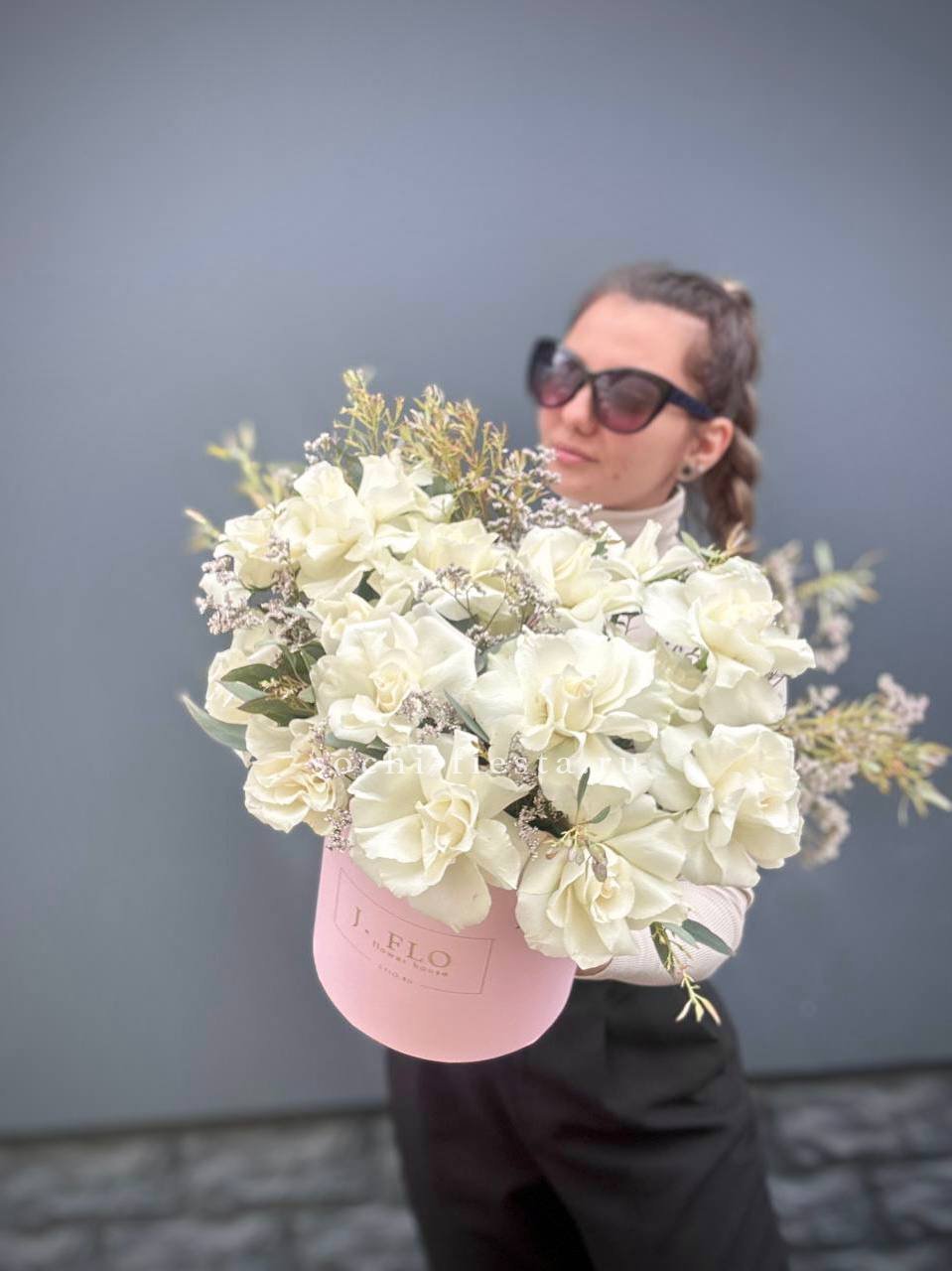 Пионовидные кустовые розы формируют плотный купол с мягкими переходами оттенков. Каждый бутон раскрывается слоями, создавая объёмную текстуру. Эвкалипт добавляет свежести композиции в цилиндре.