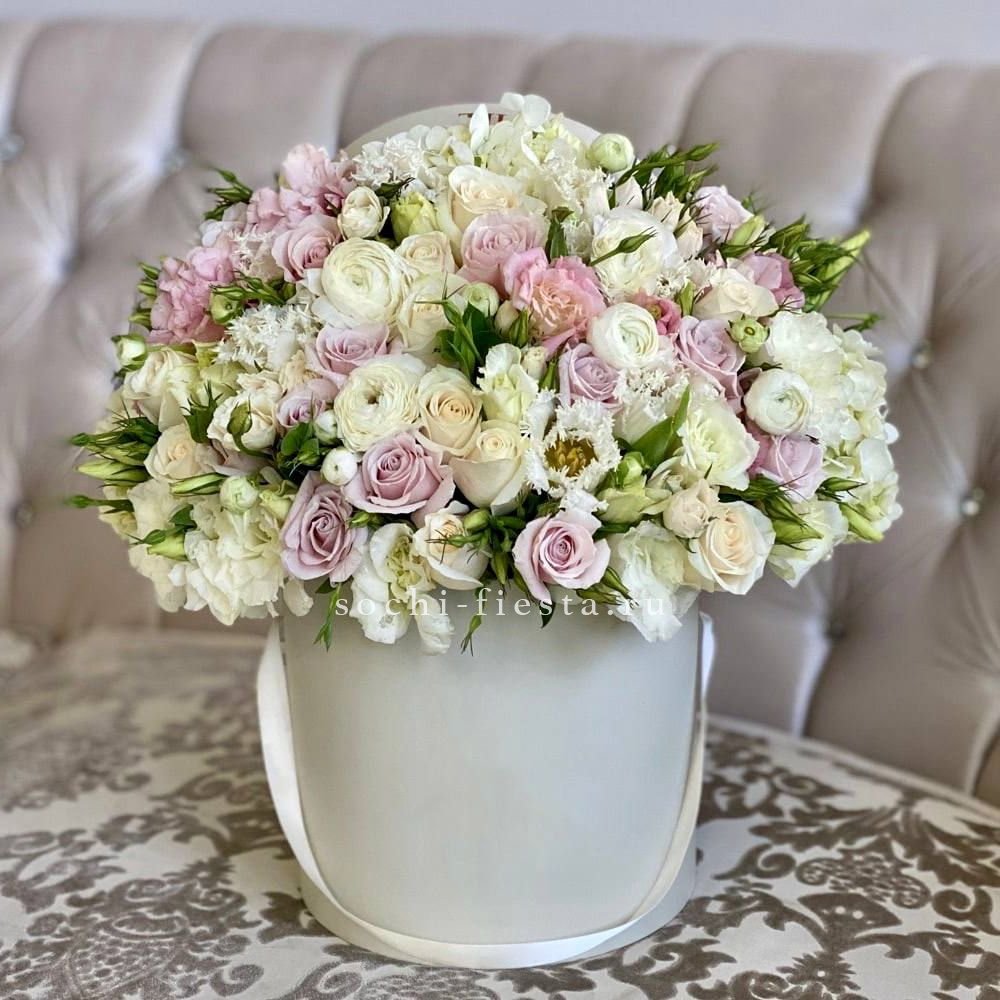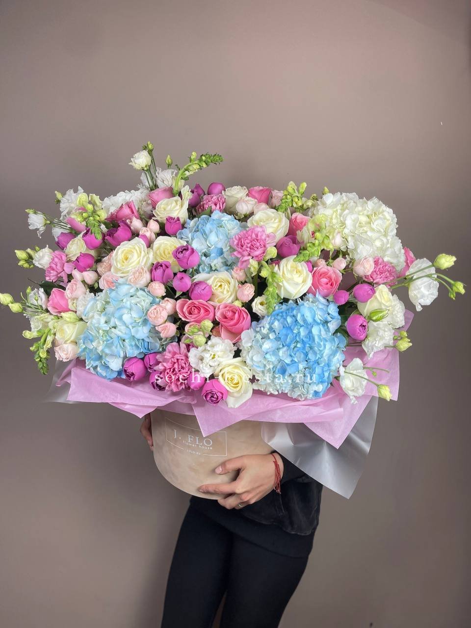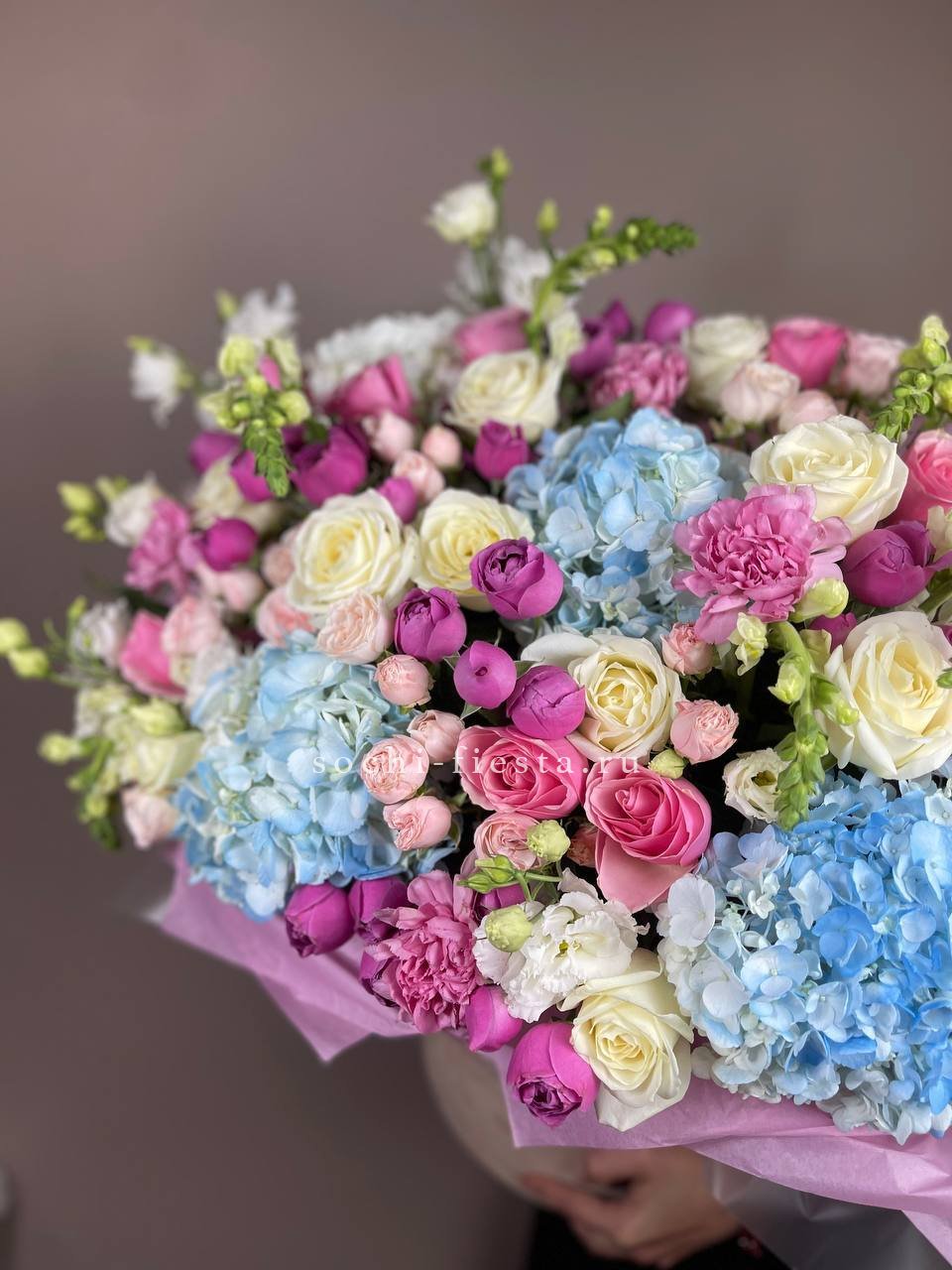 гортензия, диантус, бомбастик, мисти баблс, розы, антиринум, эустома, бокс гигант.