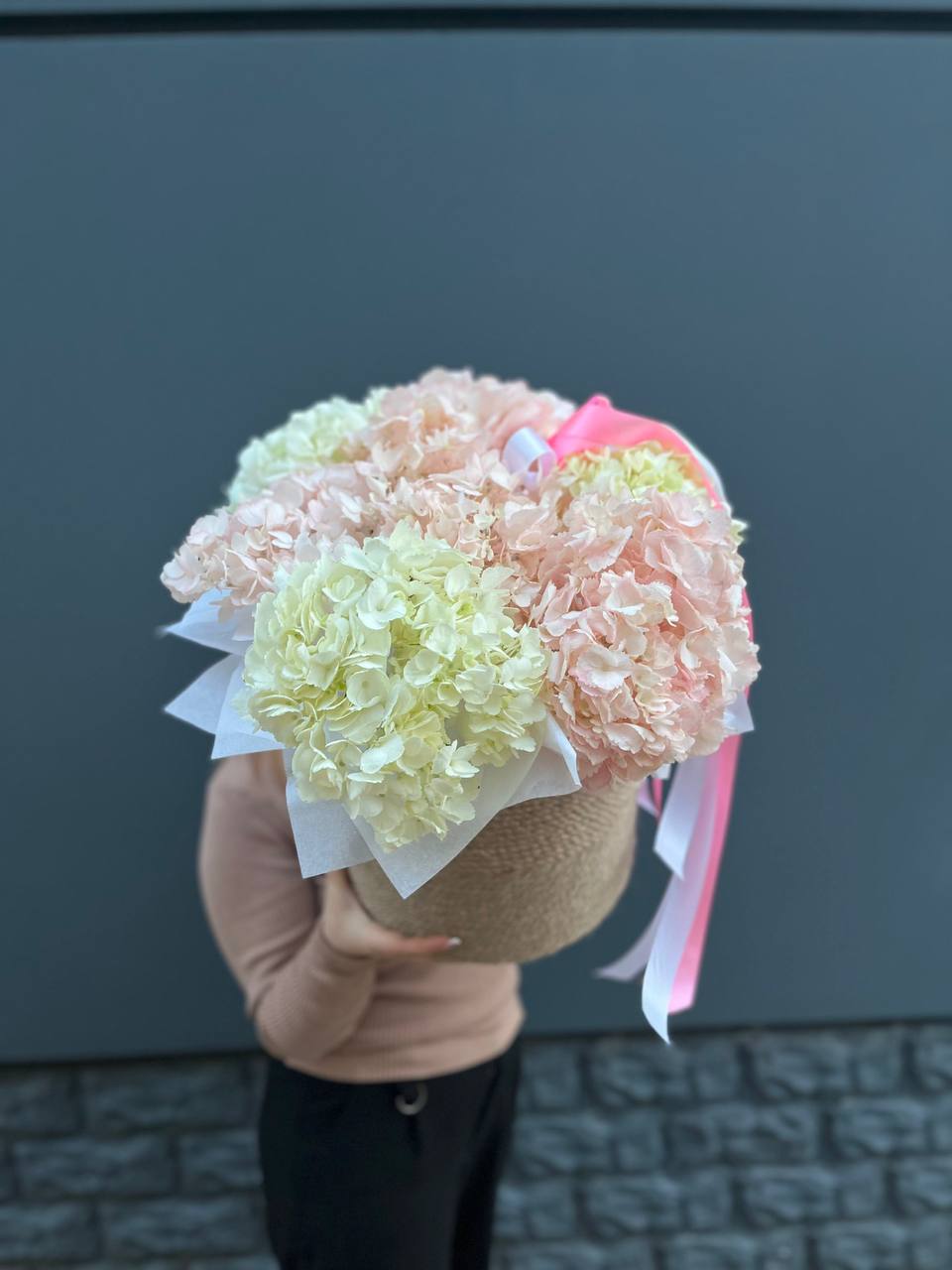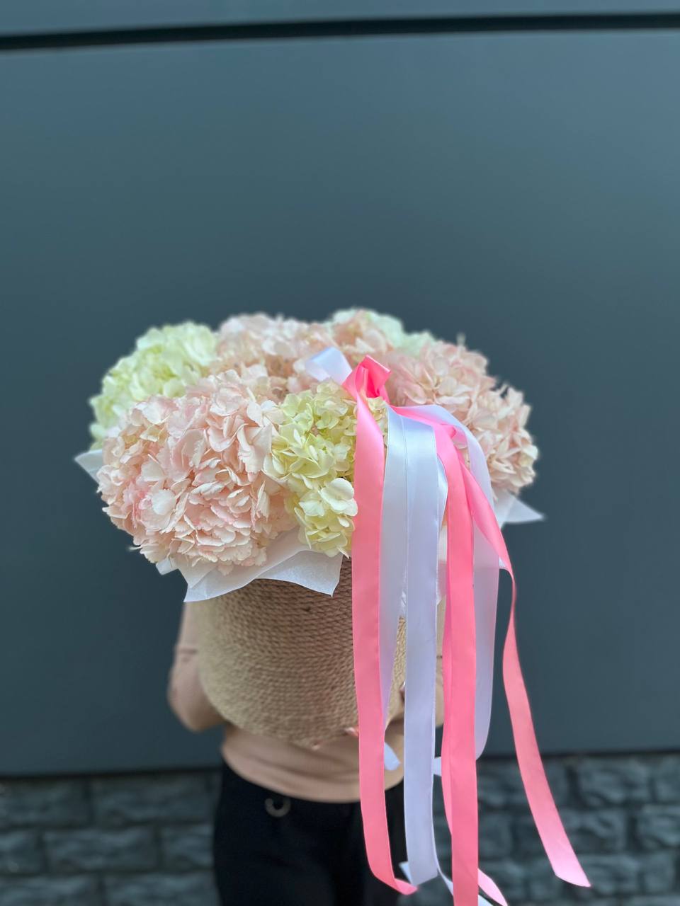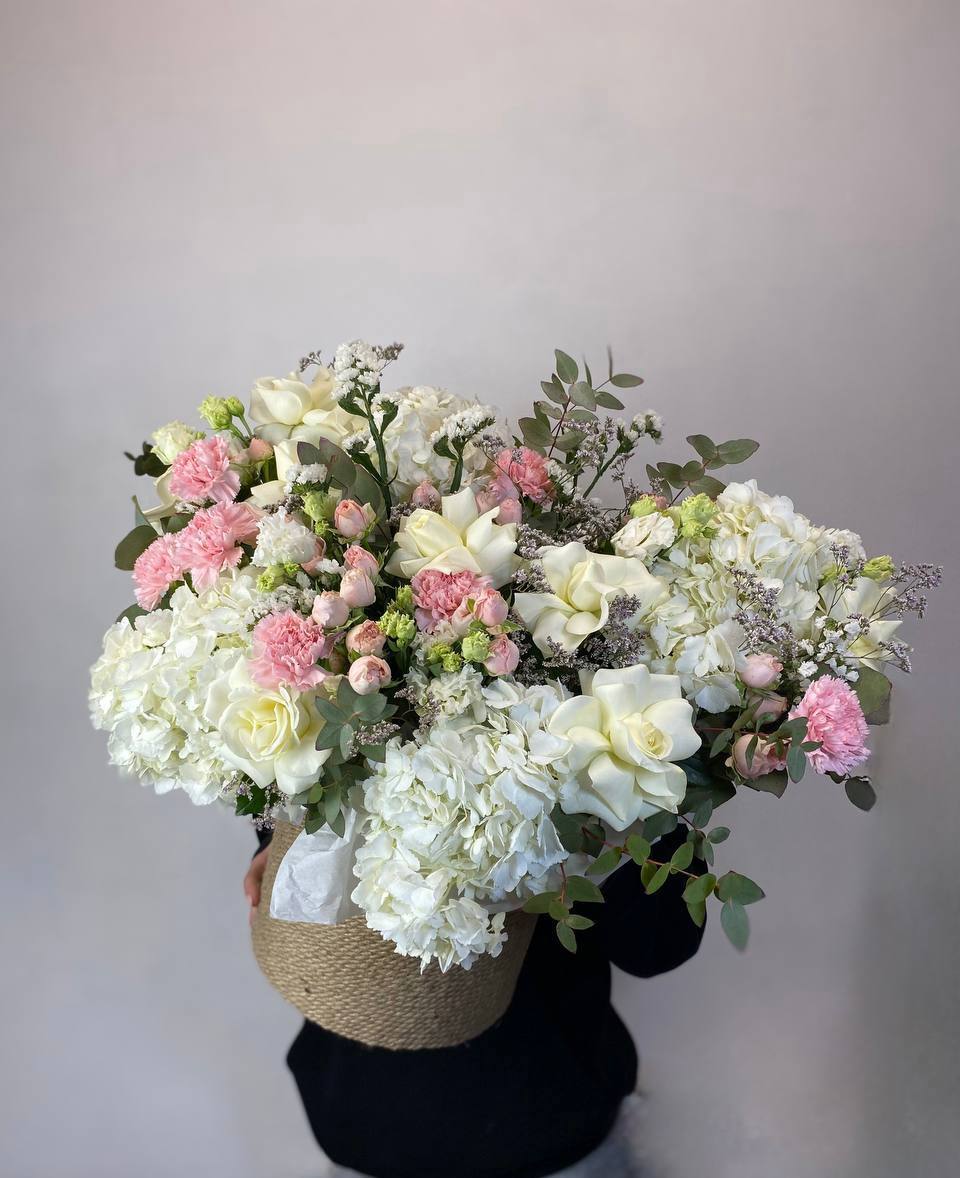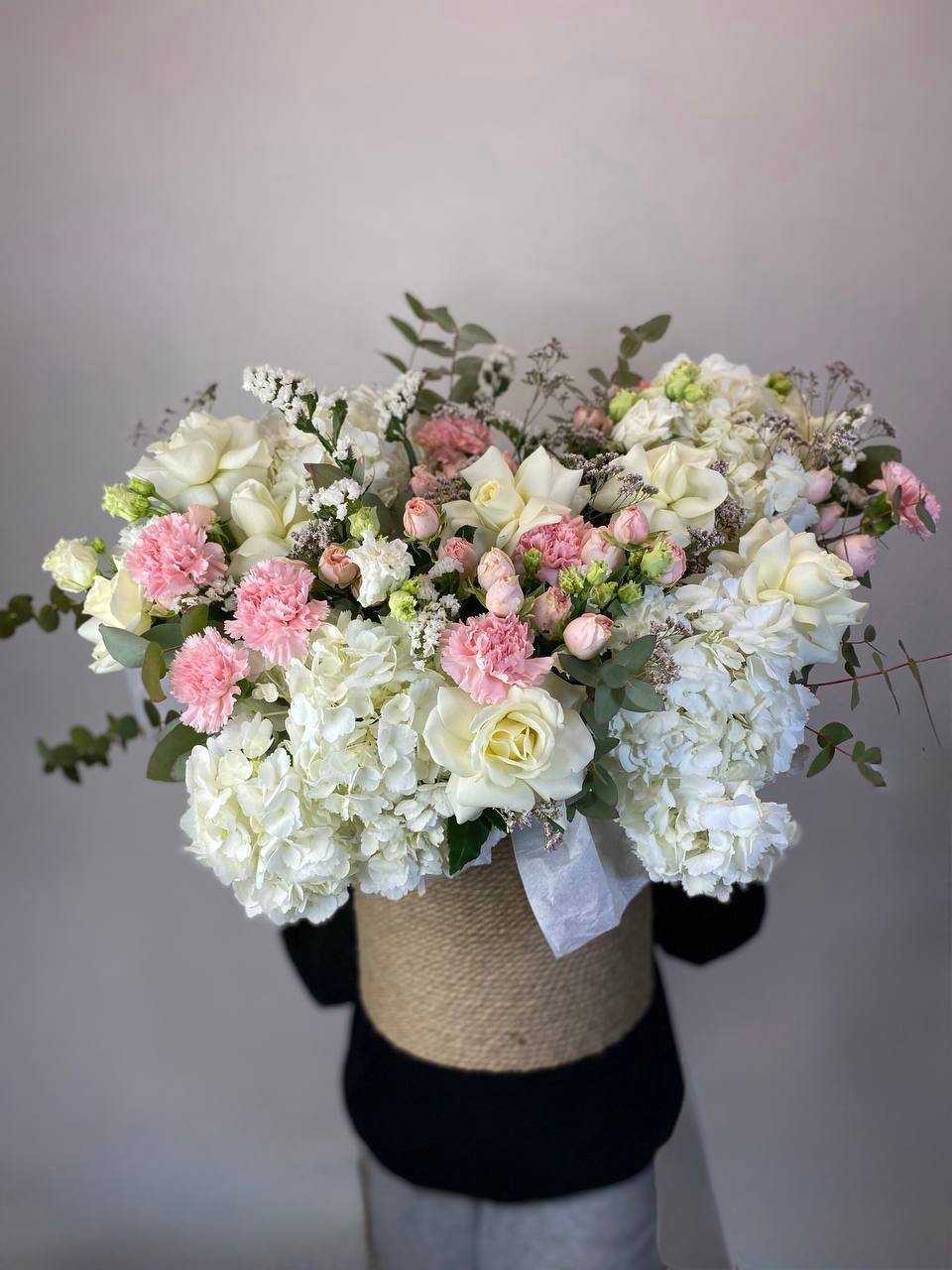 пионовидные розы Мисти Бабблс, гортензия, розы, диантусы, эустома, маттиола, джутовое кашпо, стифа, эвкалипт.