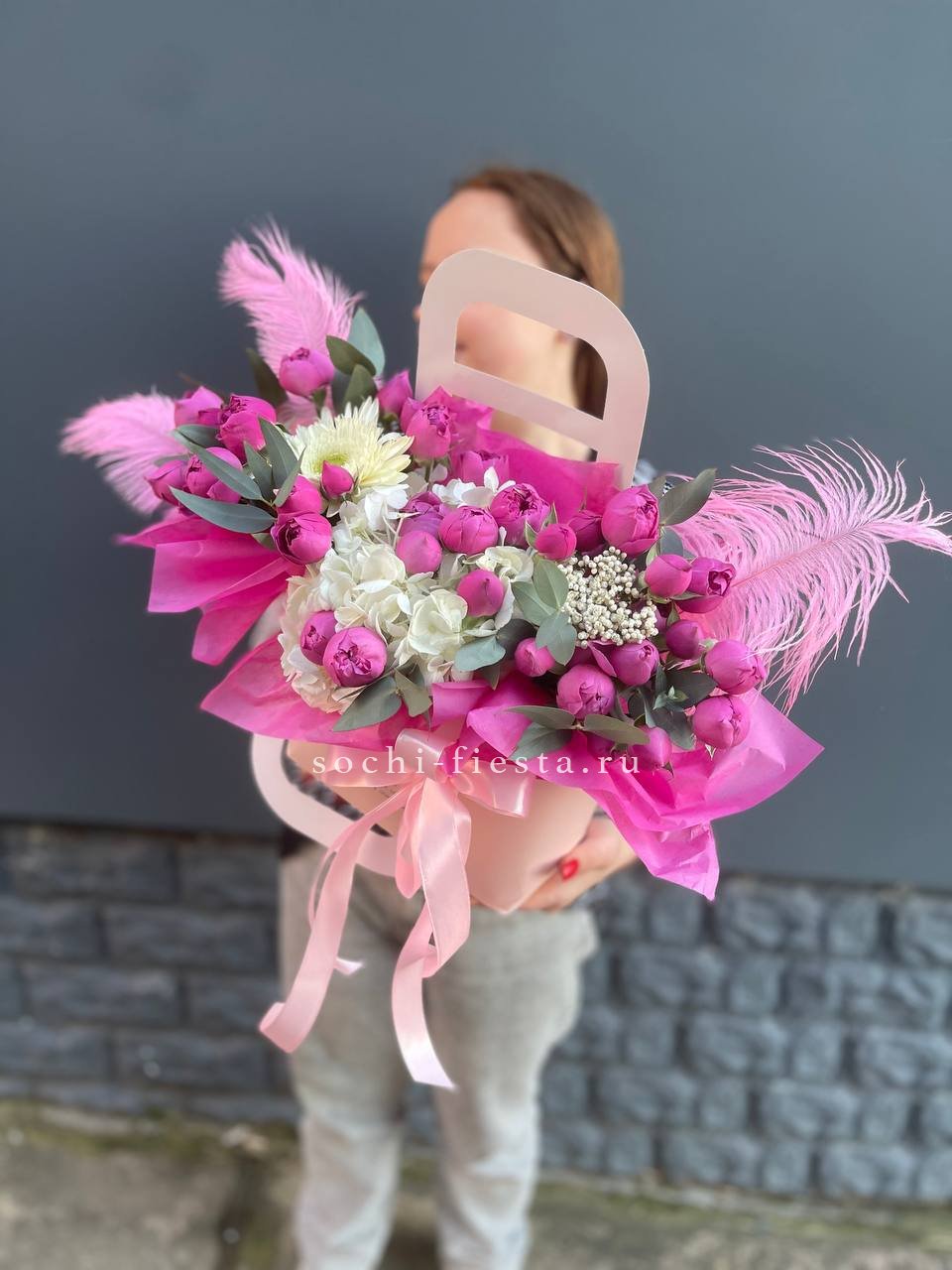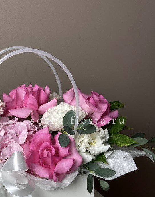 альстромерии (в зависимости от сезона, возможна замена), розовые розы, хлопок, диантусы, лента, сумка-кашпо.