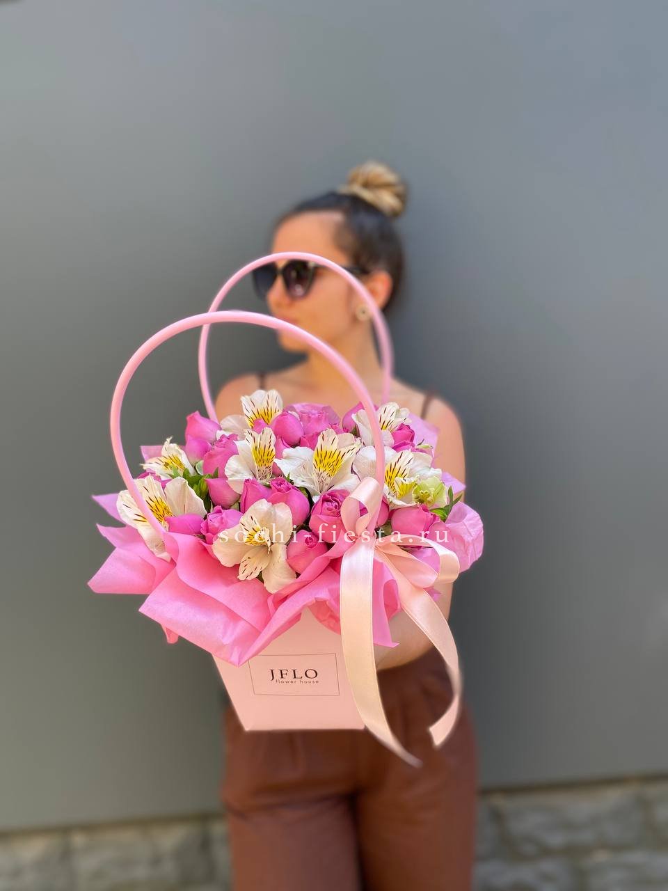 пионовидные кустовые розы, альстромерия, лента, сумка-кашпо.