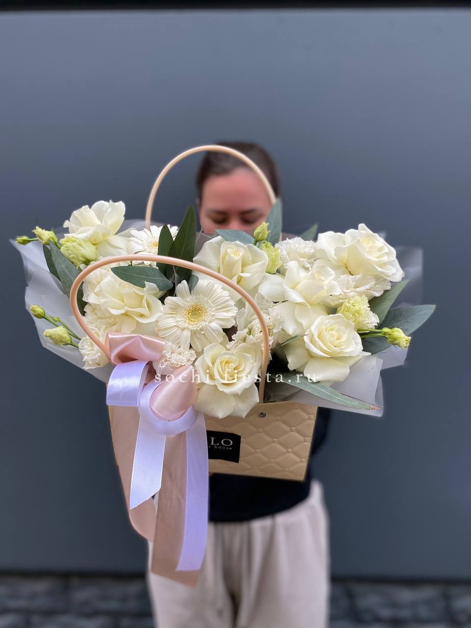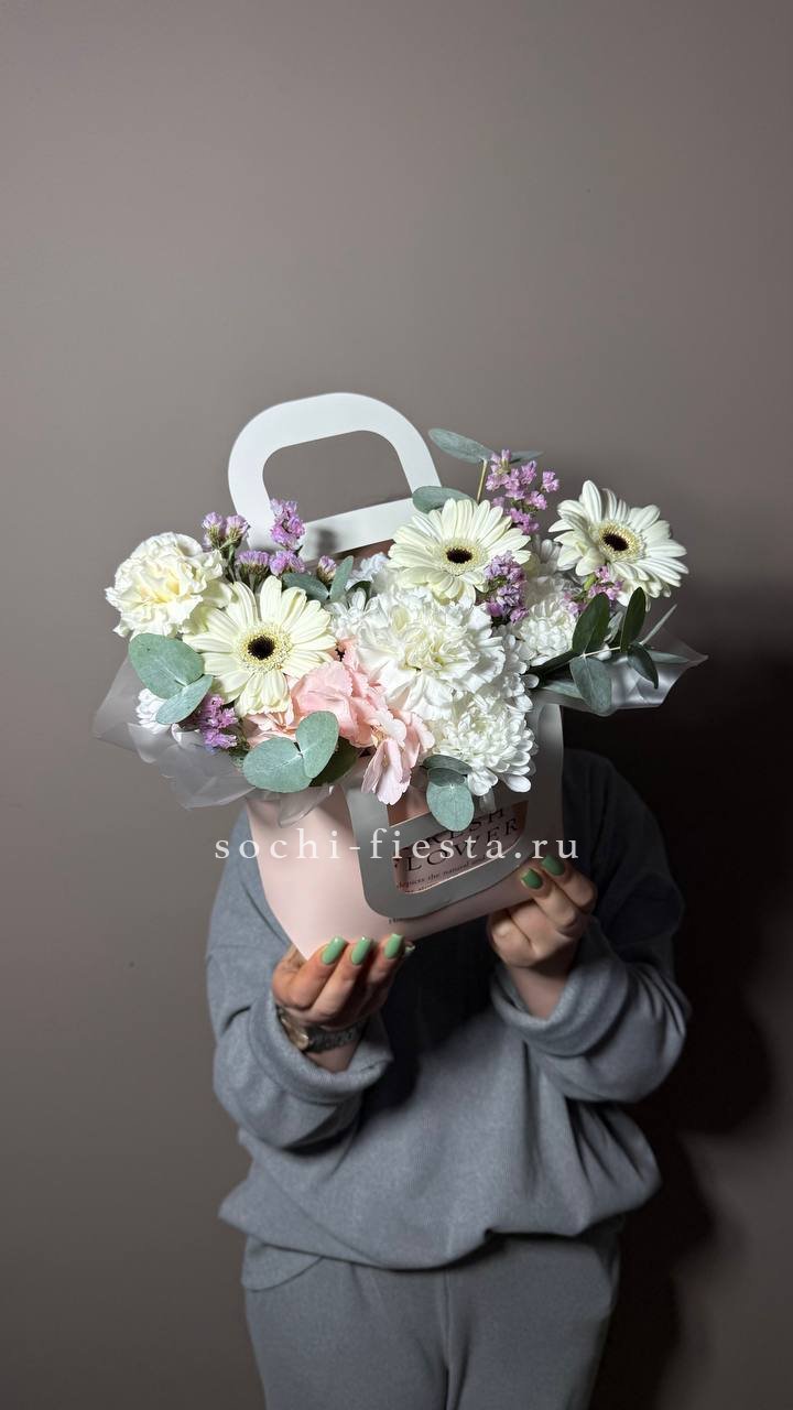 гербера, хризантема, диантус, статица, гортензия, сумочка.
