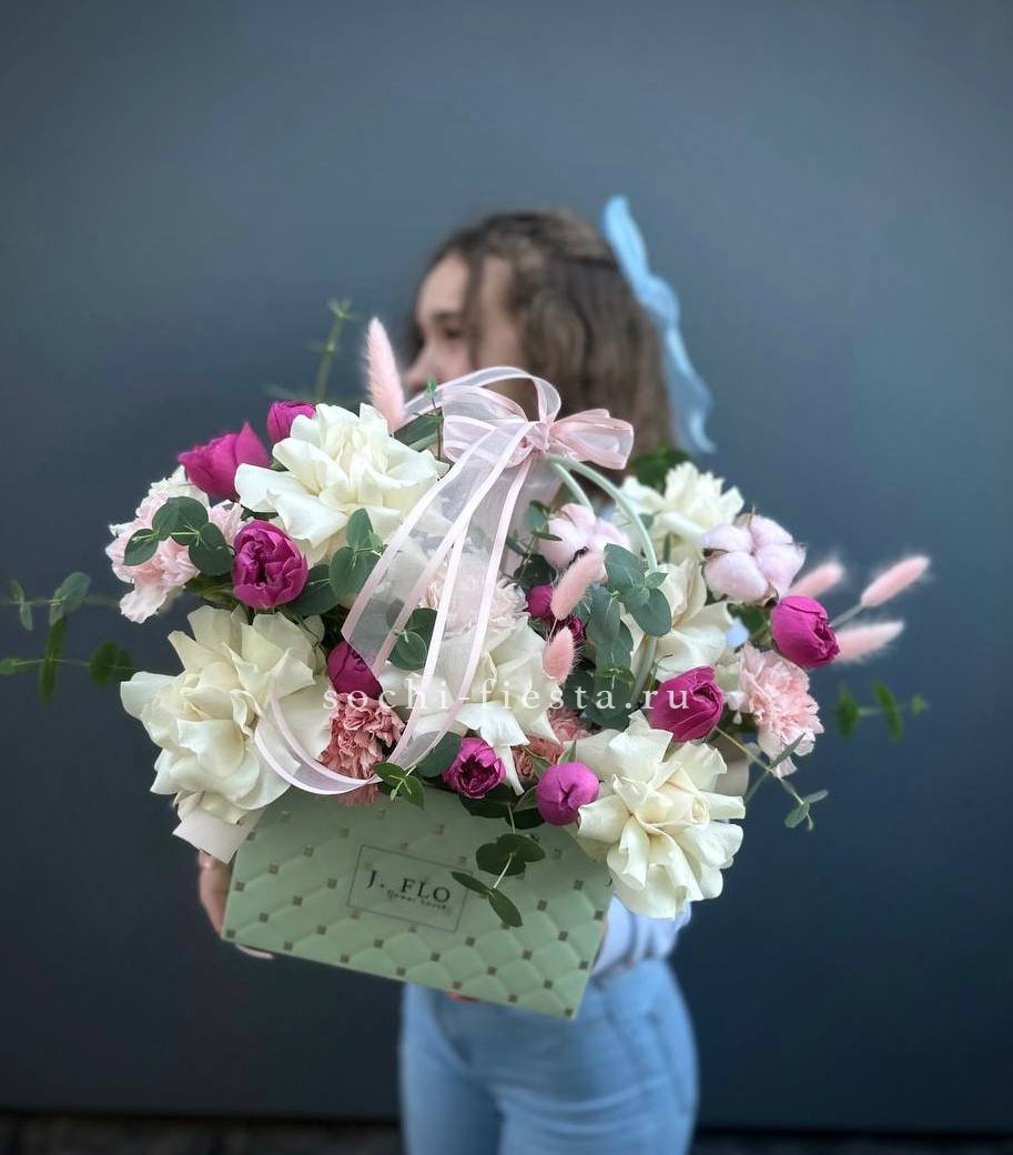 Розовые оттенки переплетаются с солнечными пушистыми шариками мимозы и белоснежным хлопком. Весенняя композиция в удобной сумочке дарит ощущение первых теплых дней и пробуждения природы.