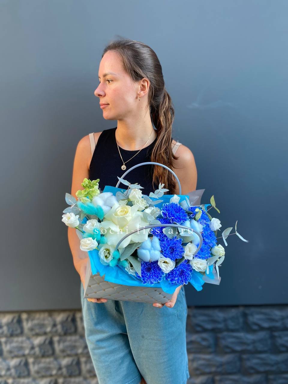 Белые розы и хризантемы сочетаются с воздушной эустомой и хлопком в сумочке. Светлая гамма с прохладным оттенком напоминает морскую свежесть и создает спокойное настроение.