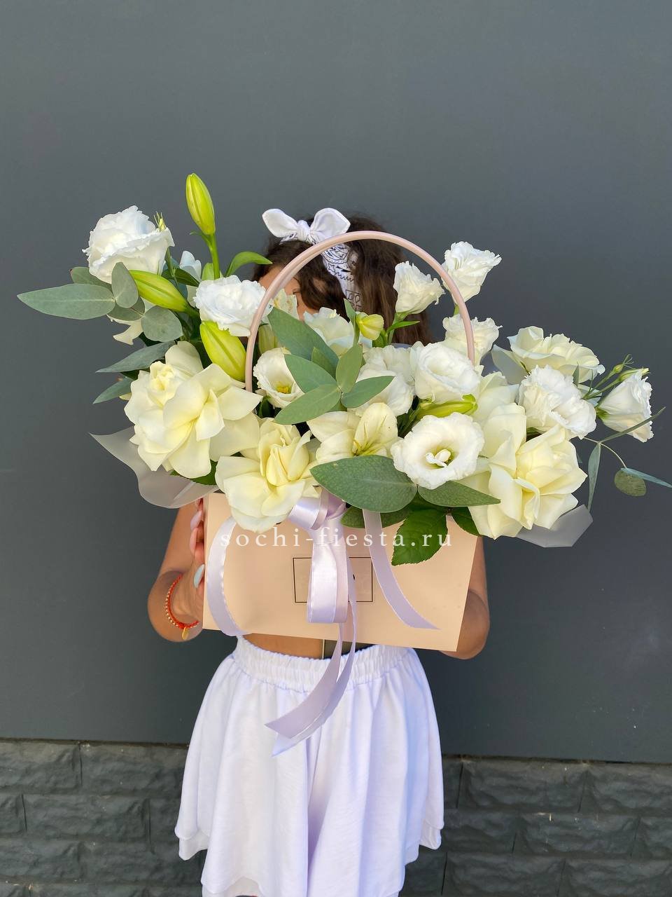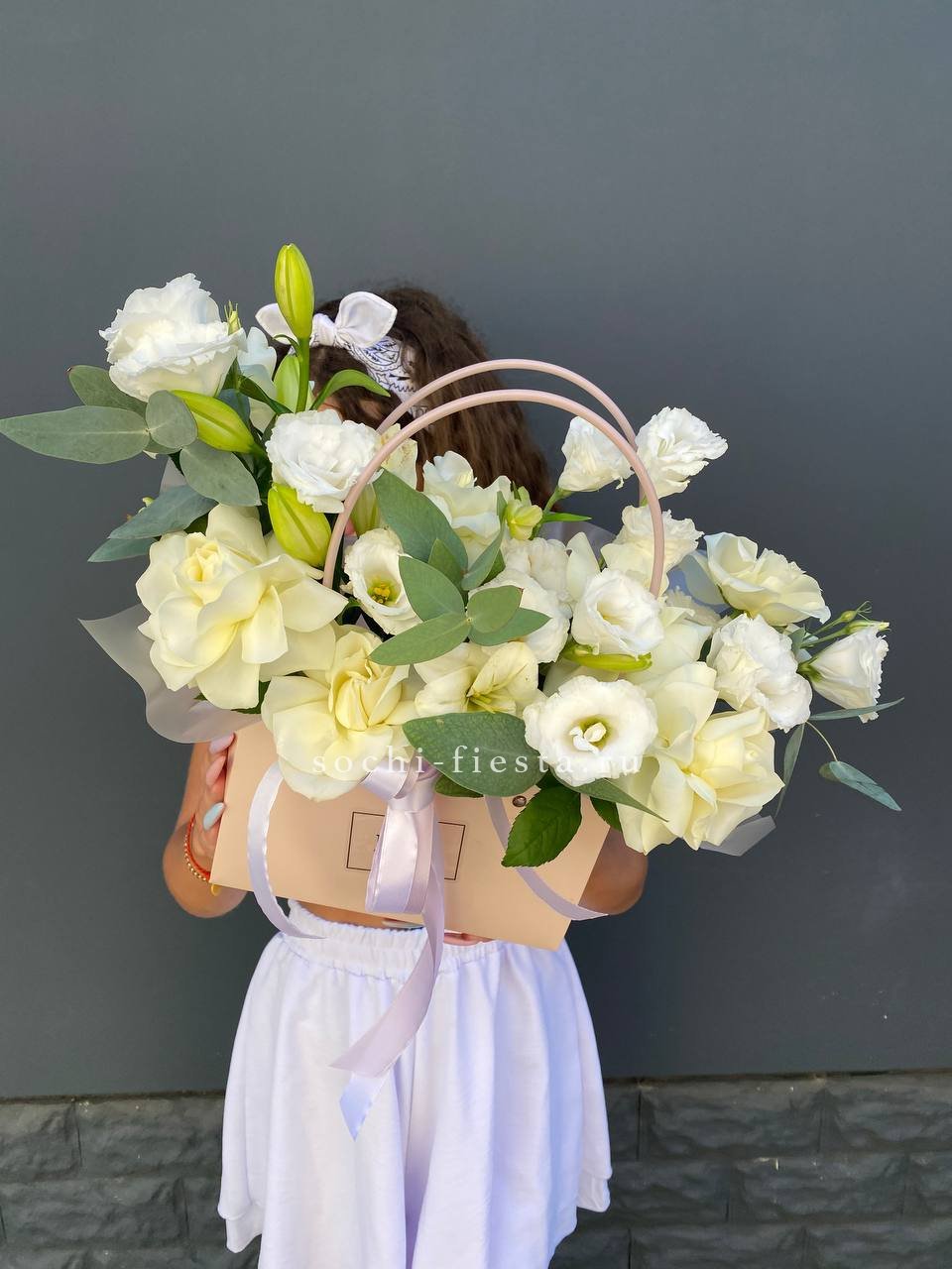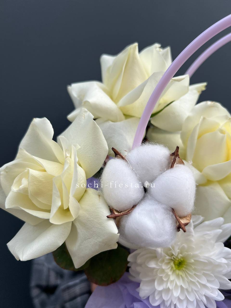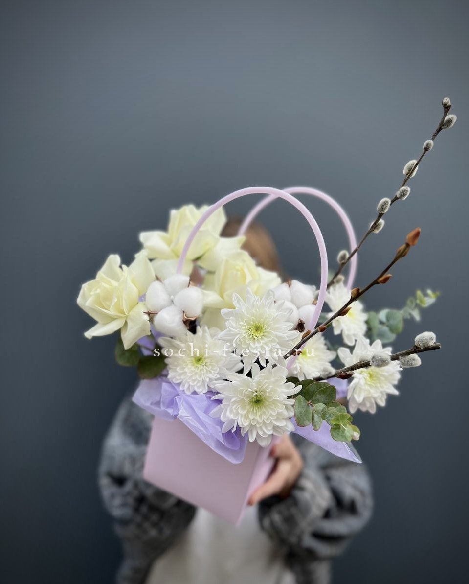 Французские розы собраны в аккуратную форму и помещены в сумочку. Компактная композиция легко помещается на столе или полке, сохраняя свежесть и опрятный вид.
