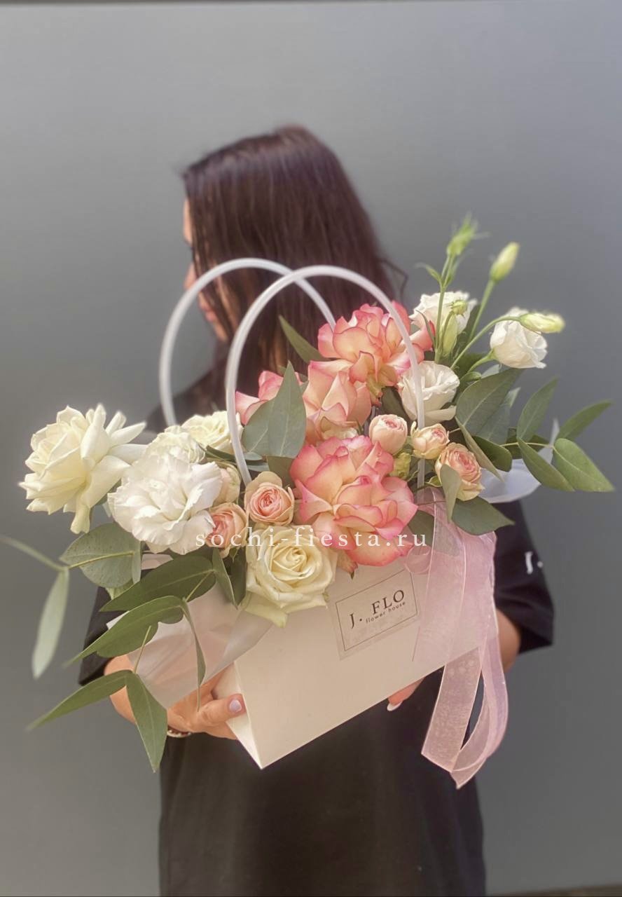 сумочка, хризантема, розовые розы, диантус, эвкалипт.
