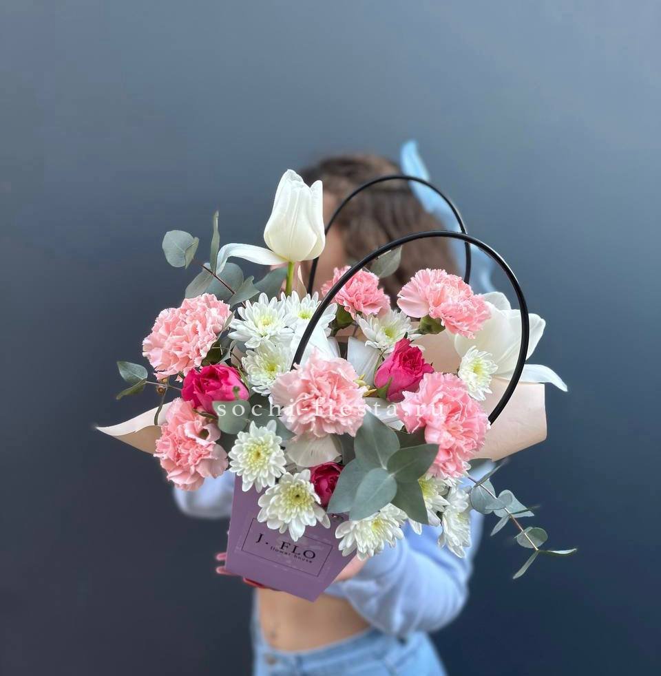 Компактный букет из сезонных цветов в природной гамме с лаконичным оформлением из крафта и бечёвки. Простая форма и естественный ритм лепестков создают непринуждённое впечатление.
