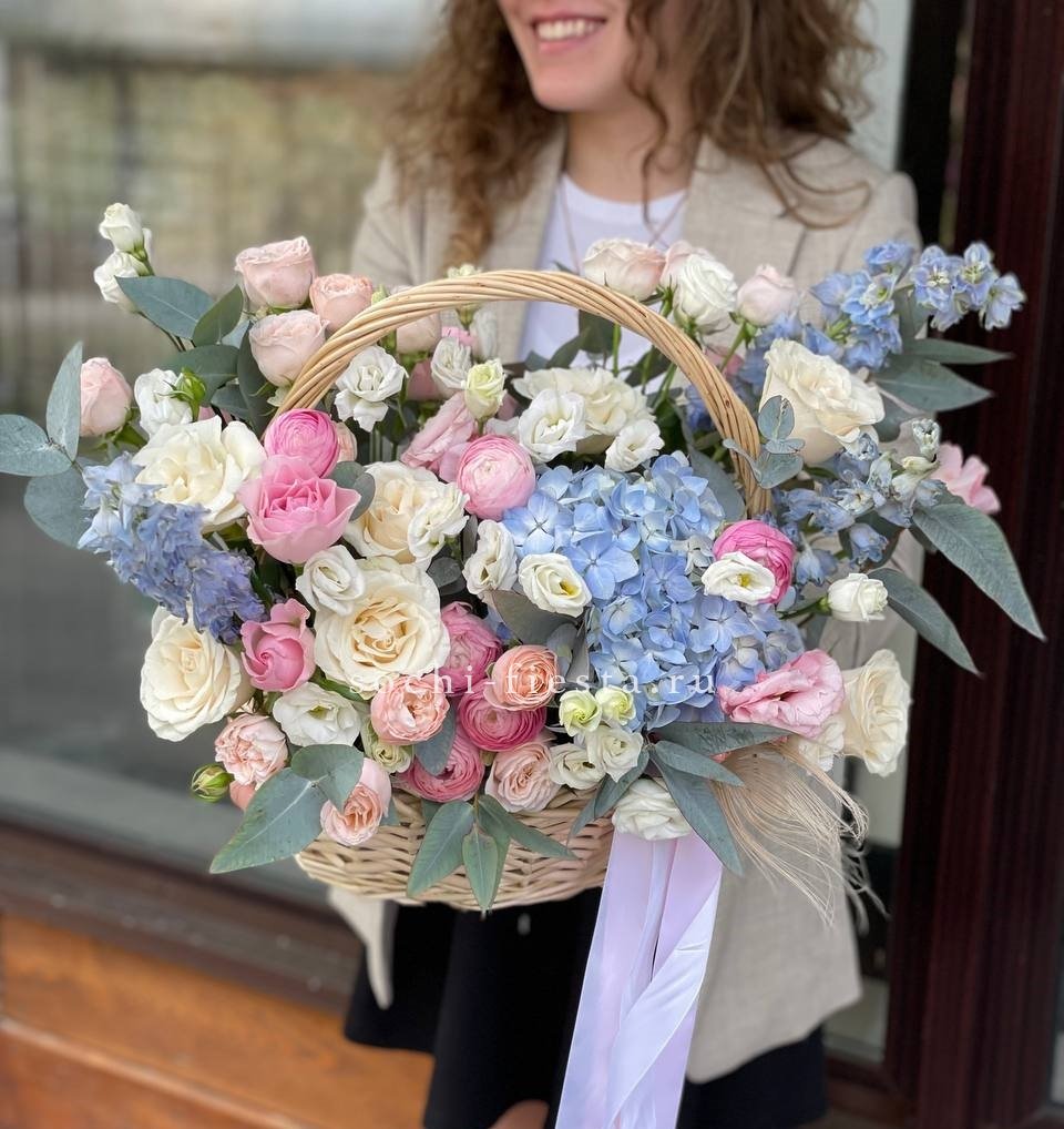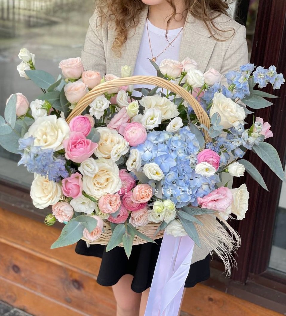 Корзина с шестьюдесятью пятью кустовыми розами Мисти Бабблс создаёт плотное облако из махровых бутонов лавандового оттенка. Эвкалипт добавляет свежести и завершает композицию.