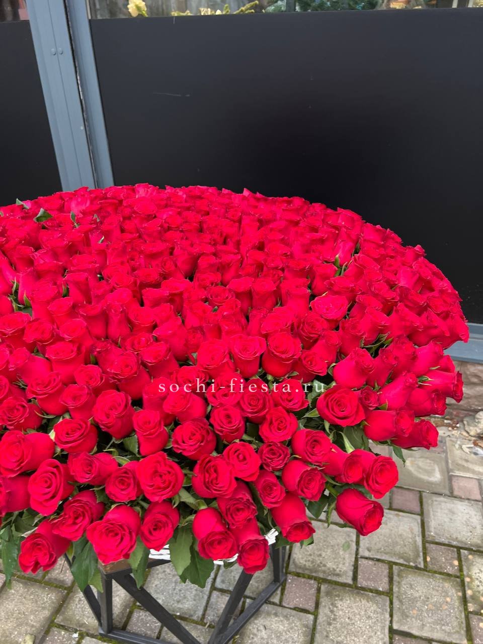 Триста пятьдесят один бутон ярко-алого цвета создают впечатление плотной цветочной волны. Это композиция, которая заполняет собой всё пространство и приковывает взгляд с первой секунды.