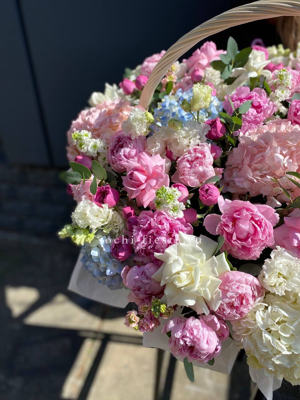 цветочная корзина с розами, мисти баблс, диантусами и гортензией.