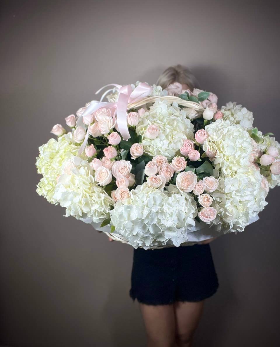Пышные шапки гортензии и яркие бомбастики собраны в корзину с плавными переходами оттенков. Композиция держит форму и создаёт объёмное цветовое пятно в любом пространстве.